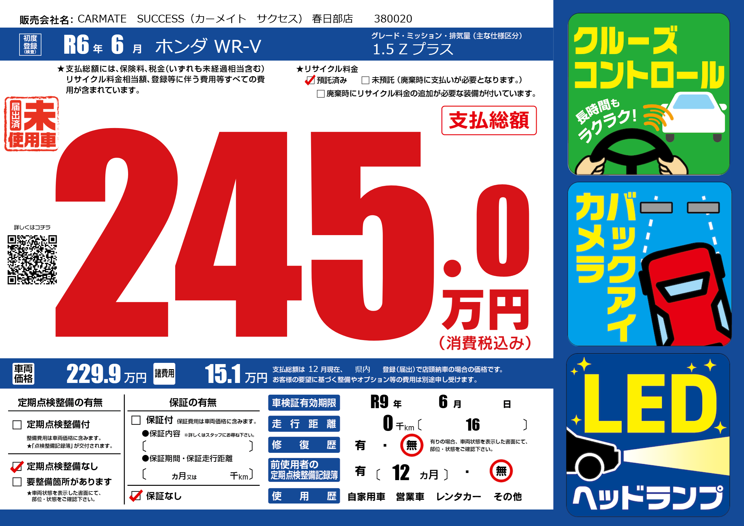 | 車名 | ホンダ WR-V | グレード ミッション 排気量 |
