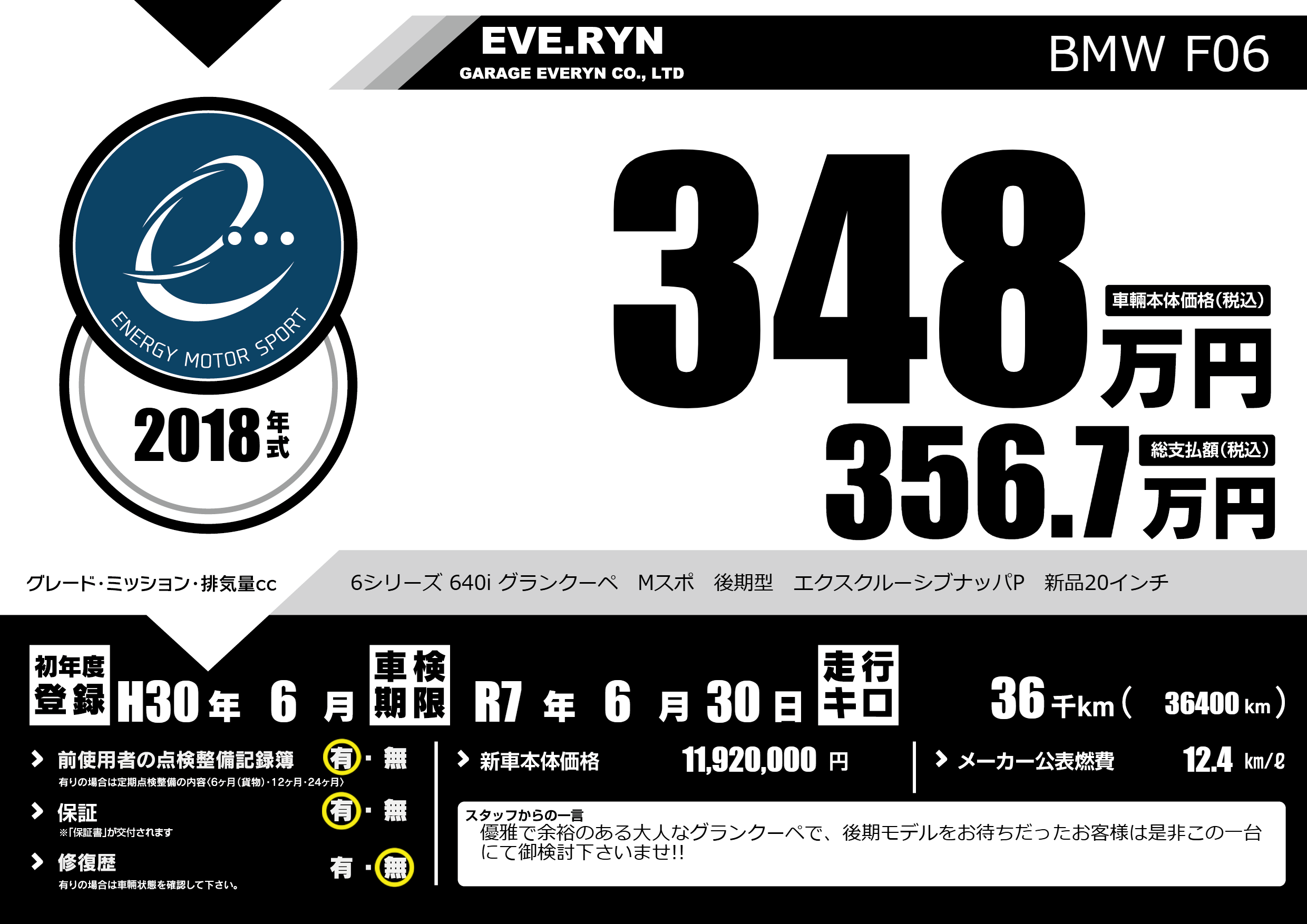 | 車名 | BMW F06 | グレード ミッション 排気量 |