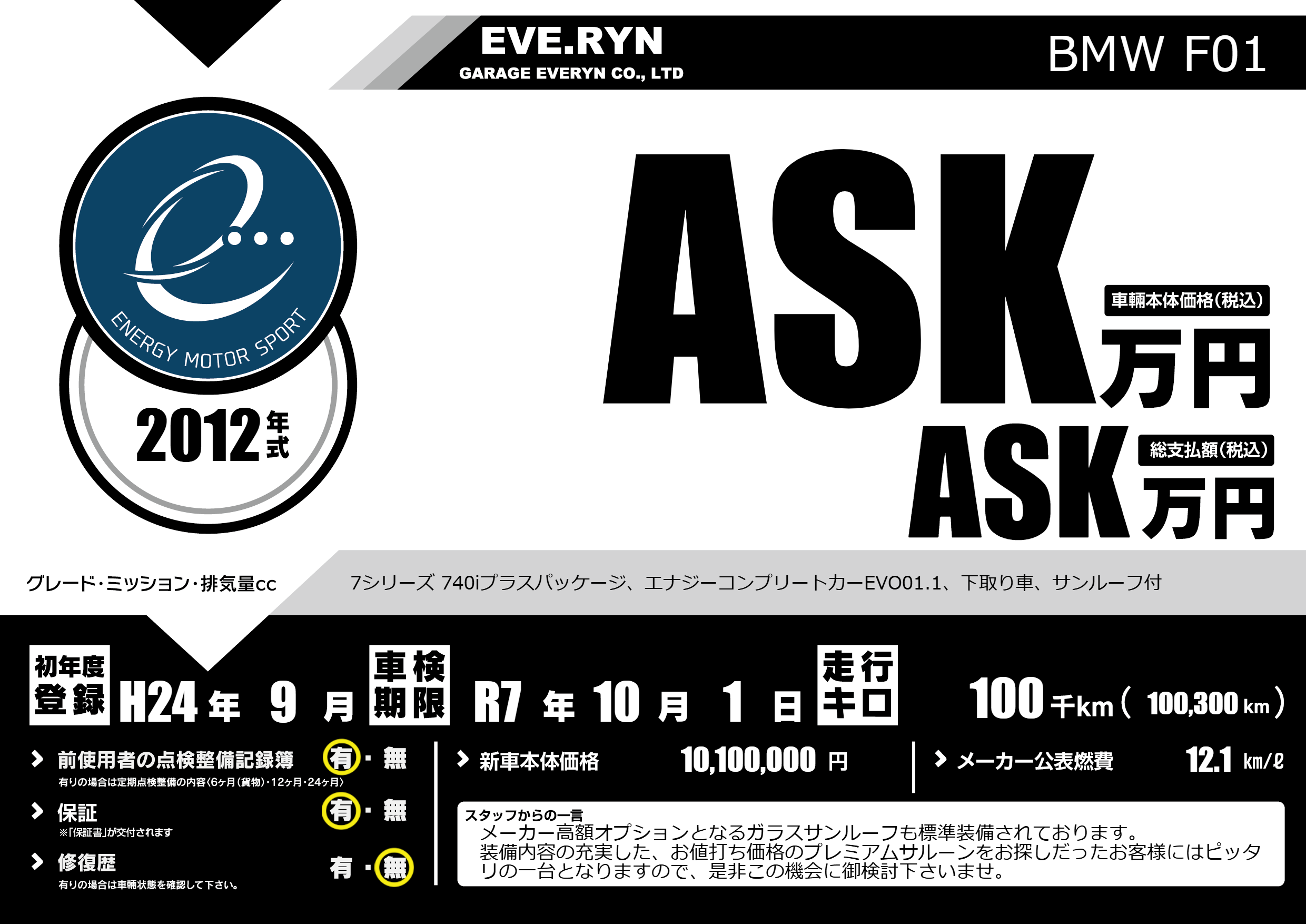 7シリーズ 740iプラスパッケージ、エナジーコンプリートカーEVO01.1、下取り車、サンルーフ付 |