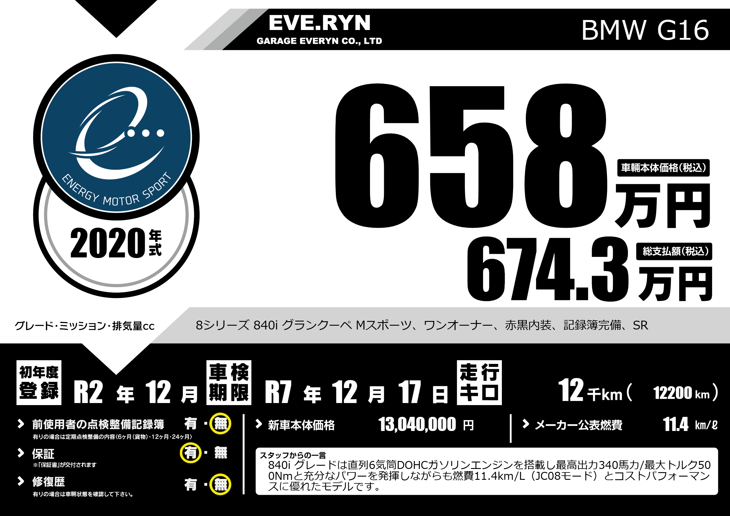 | 車名 | BMW G16 | グレード ミッション 排気量 |