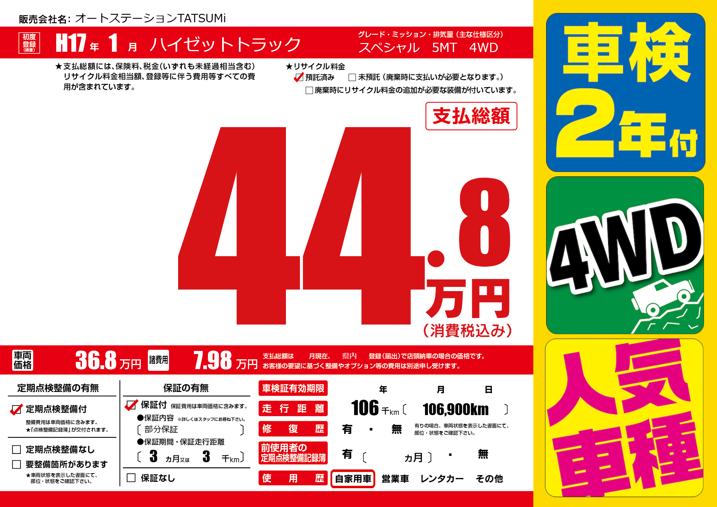 | 走行キロ | 10.6万km | 初年度登録 | H17年1月 |