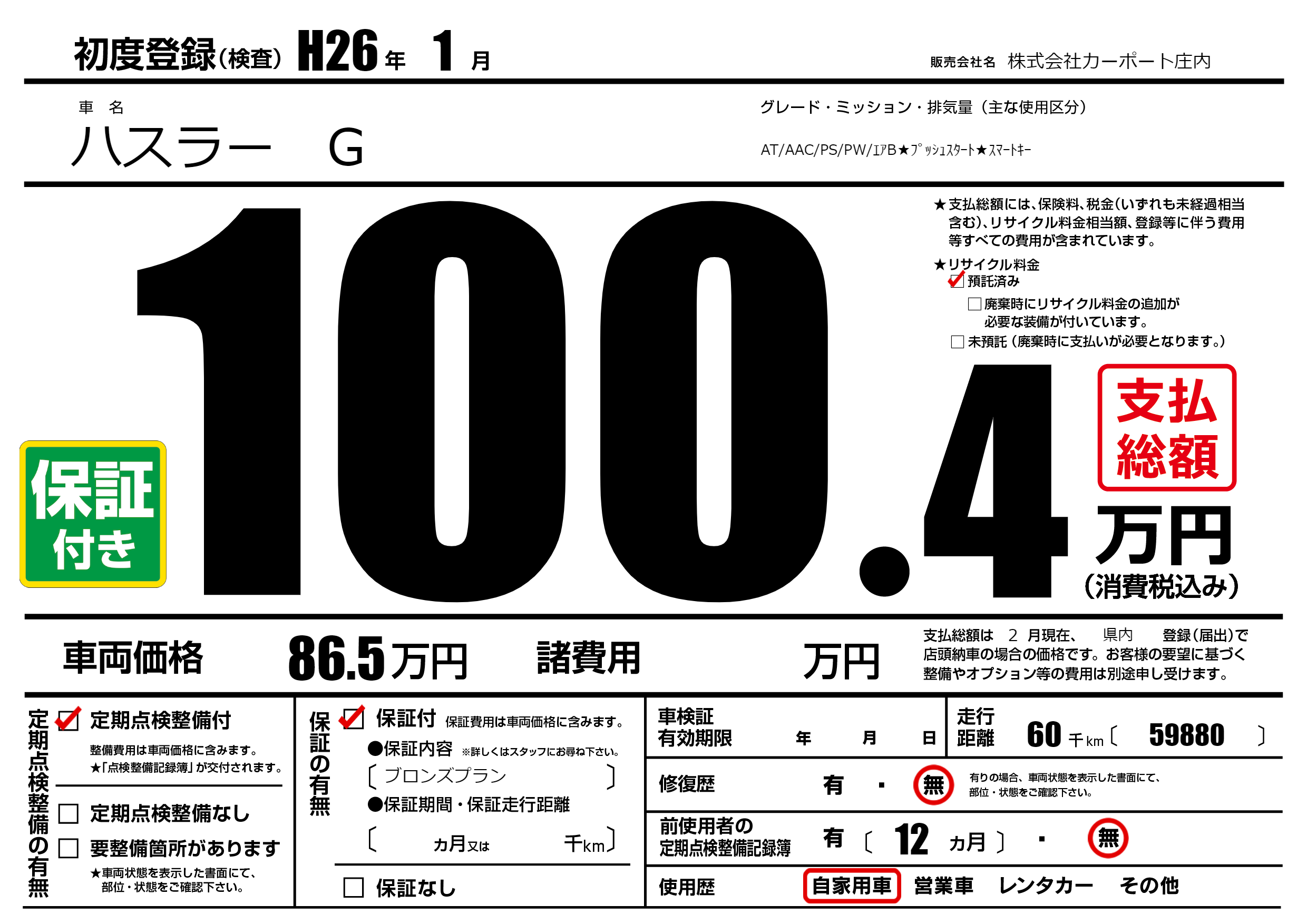 | 車名 | ハスラー G | グレード ミッション 排気量 |