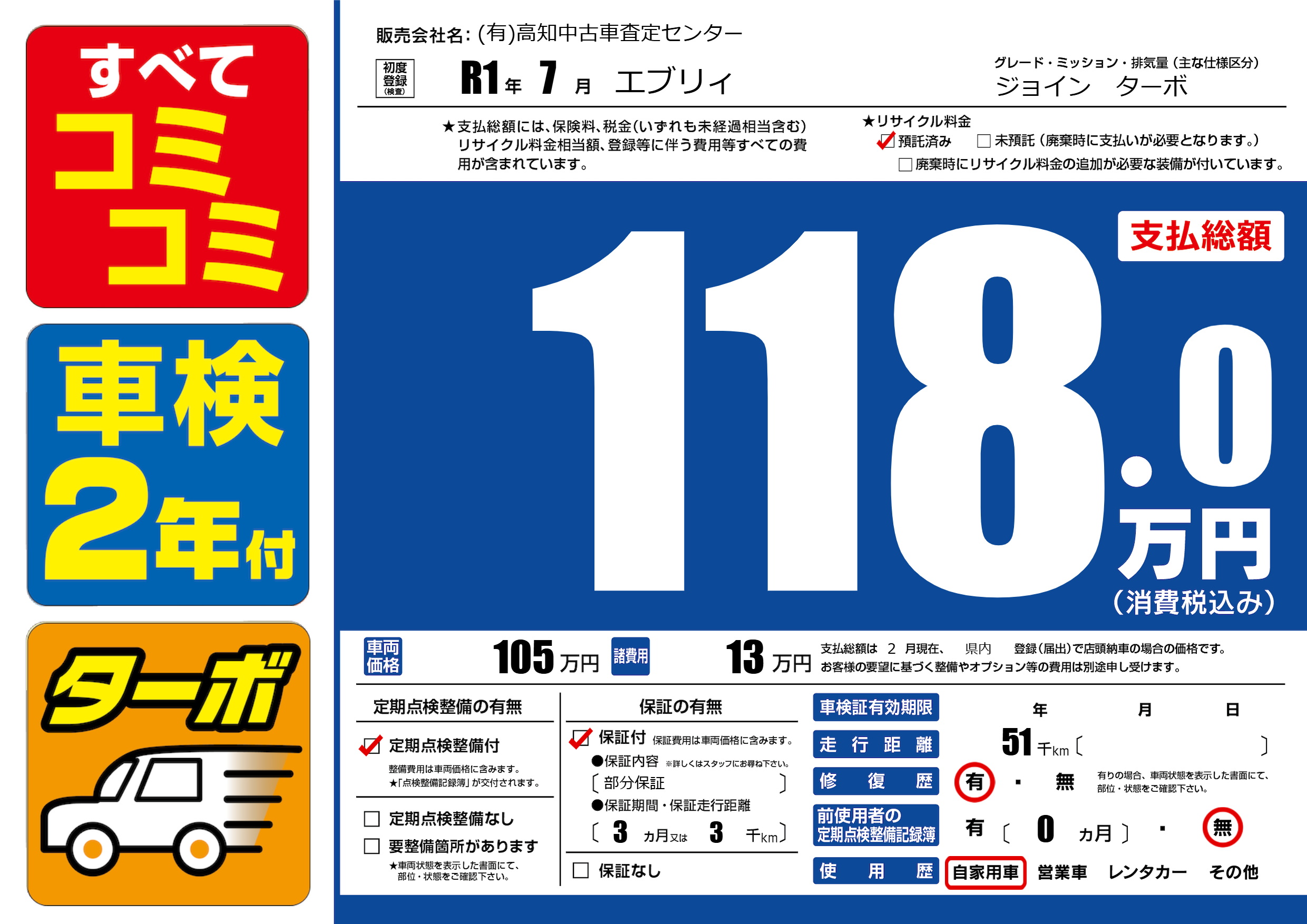 | 車名 | エブリィ | グレード ミッション 排気量 |