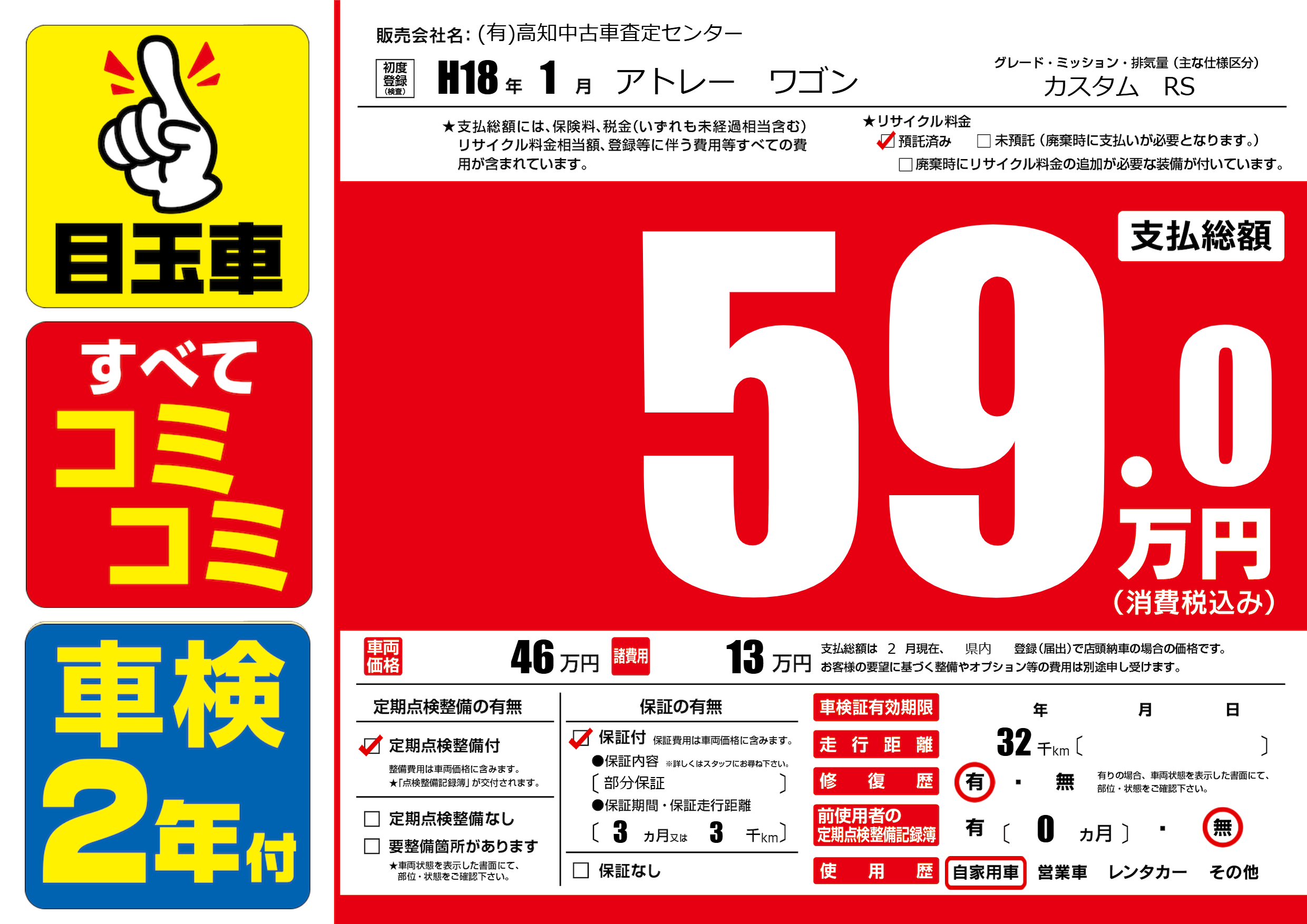 | 走行キロ | 3.2万km | 初年度登録 | H18年1月 |