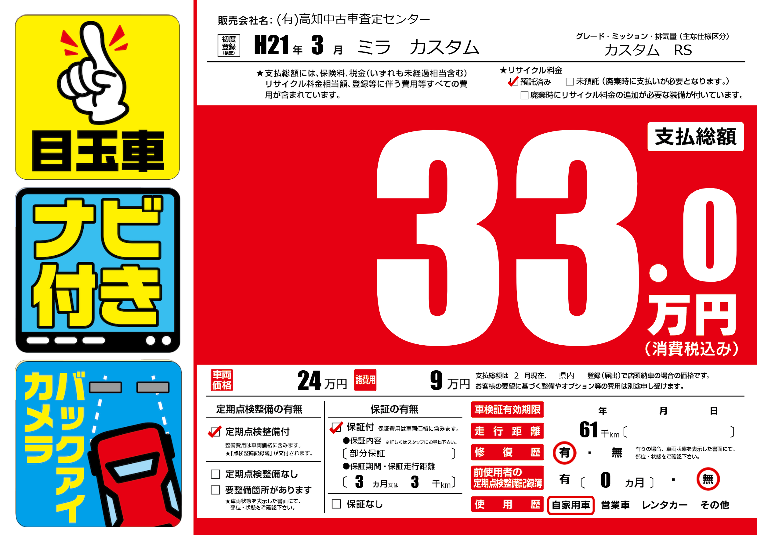 | 走行キロ | 6.1万km | 初年度登録 | H21年3月 |
