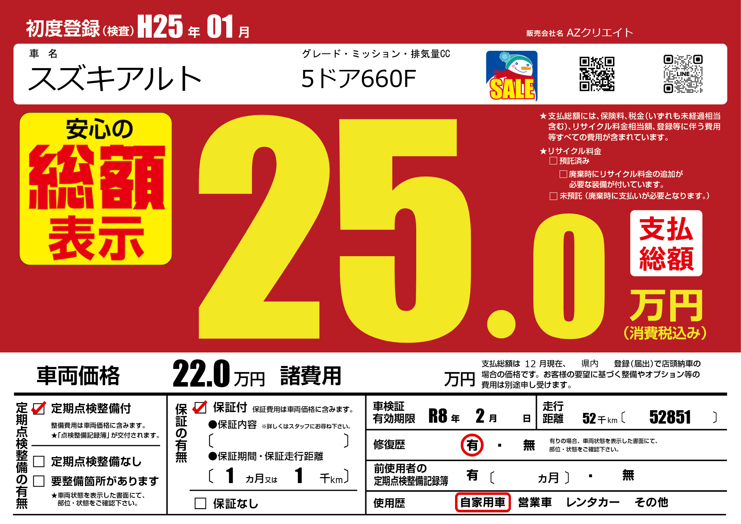 | 車名 | スズキアルト | グレード ミッション 排気量 |