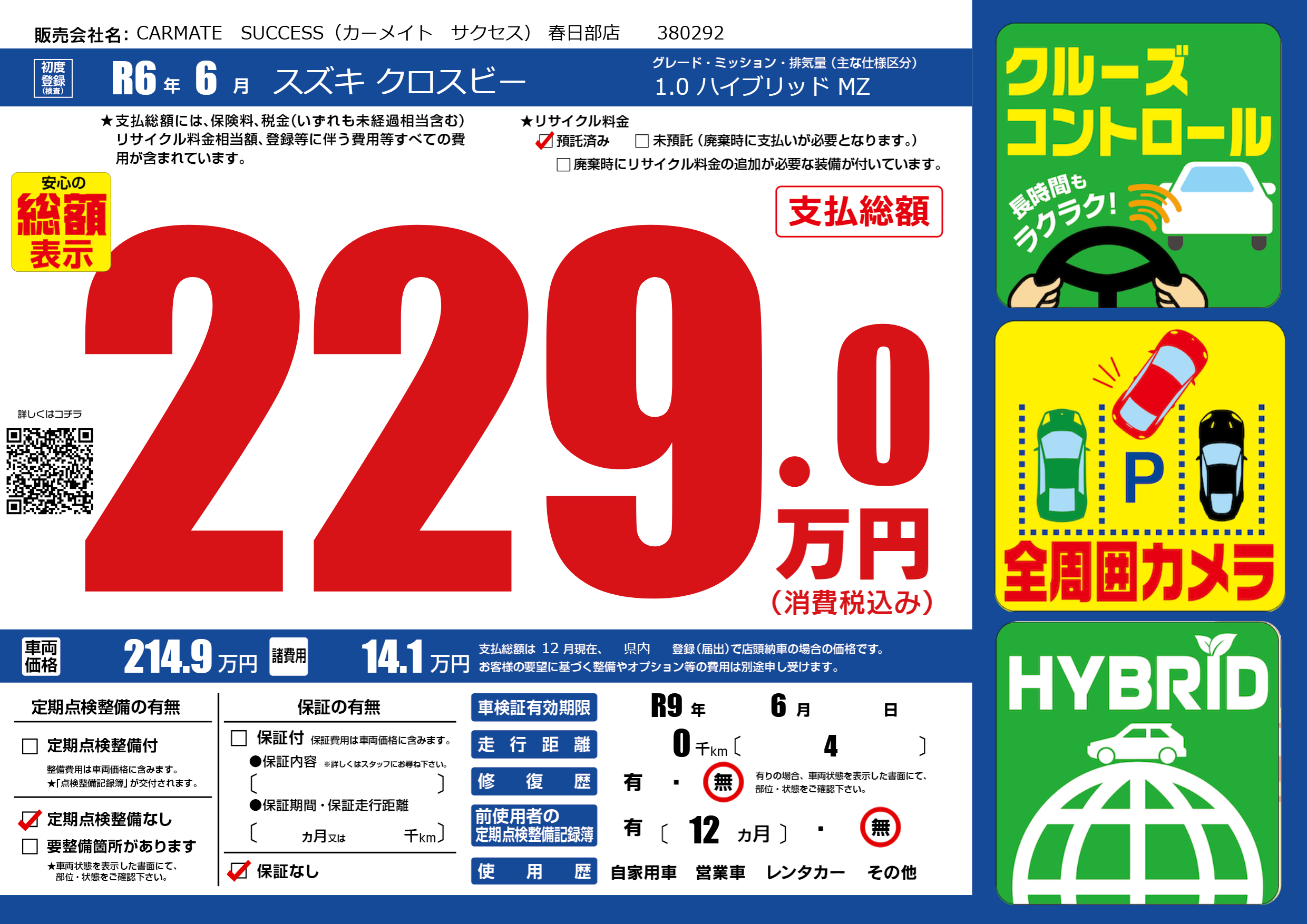 | 車名 | スズキ クロスビー | グレード ミッション 排気量 |