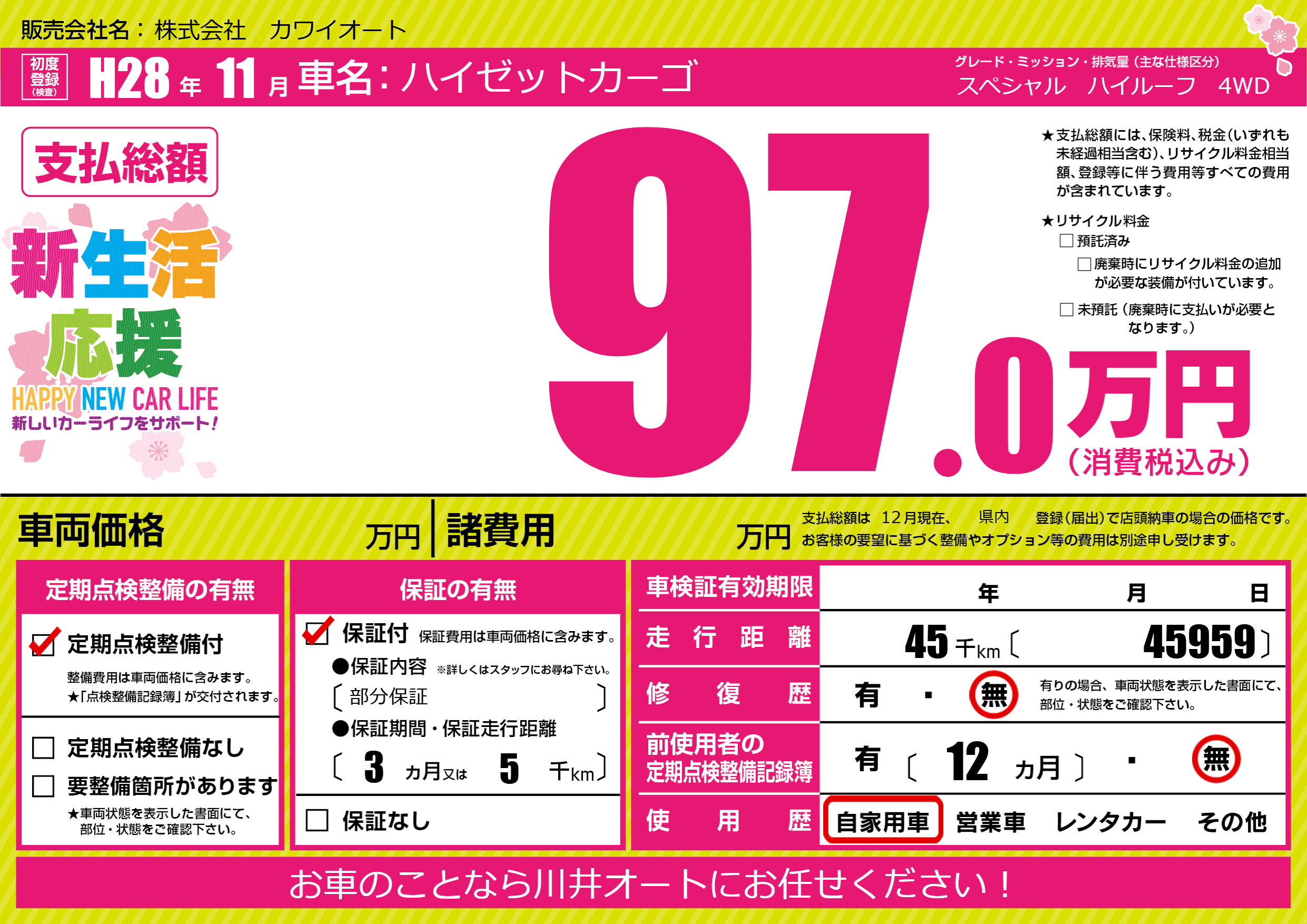 | 車名 | ハイゼットカーゴ | グレード ミッション 排気量 |