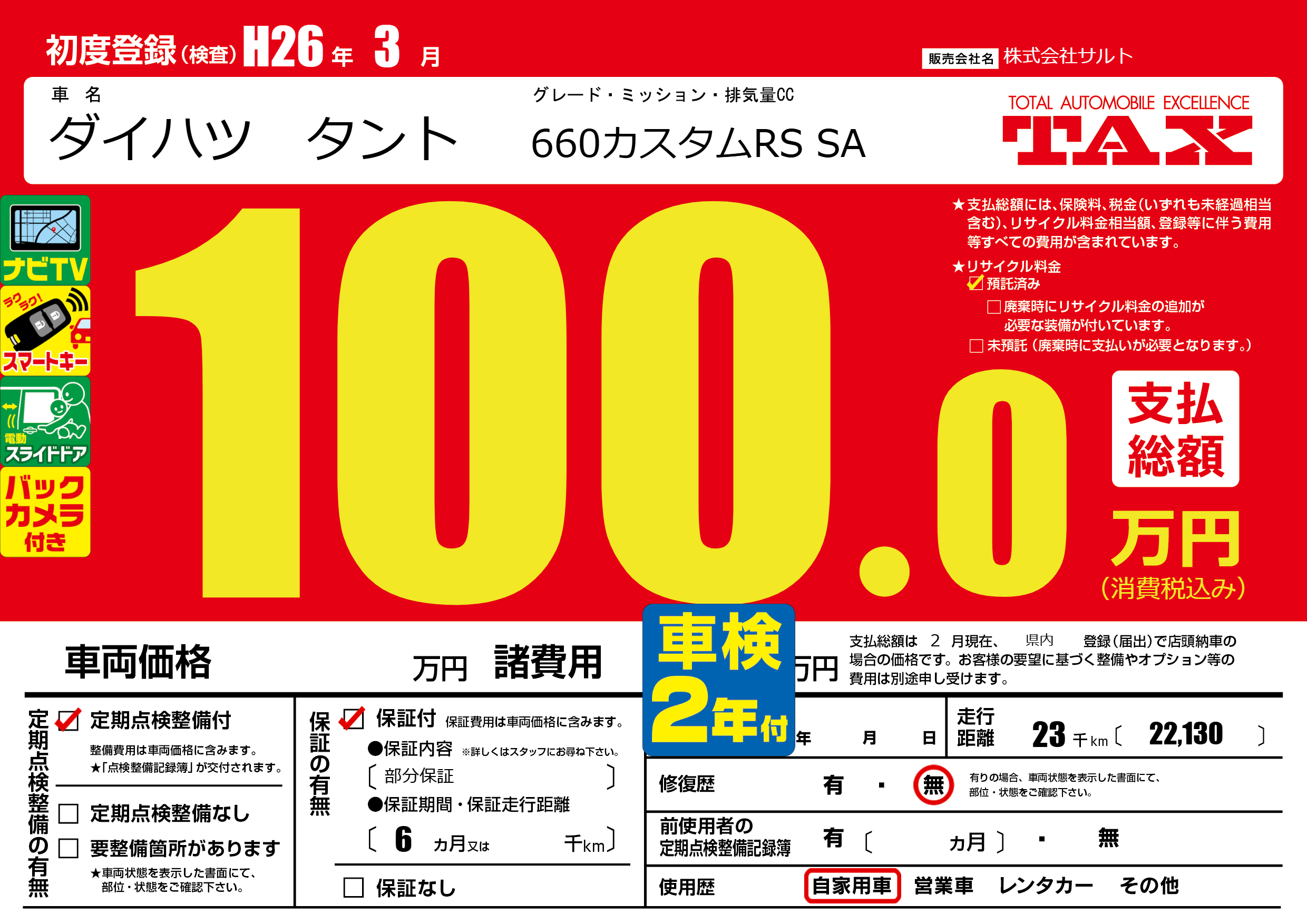 | 走行キロ | 2.3万km | 初年度登録 | H26年3月 |