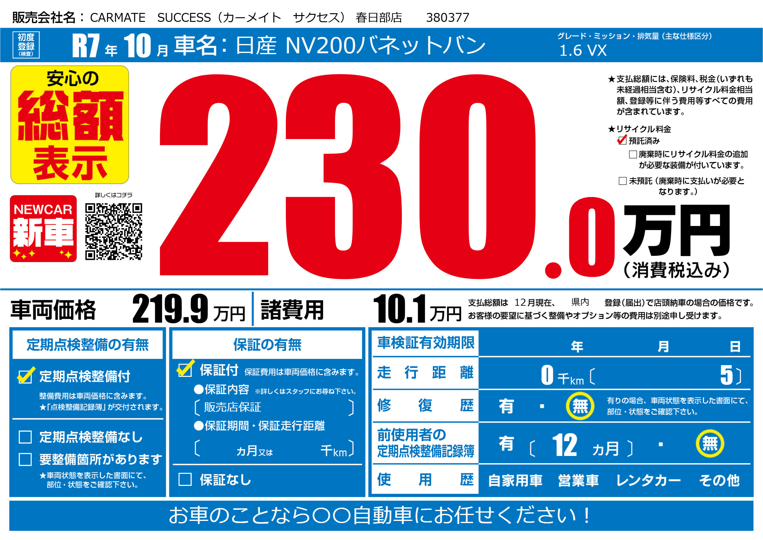 | 走行キロ | - | 初年度登録 | R7年10月 |