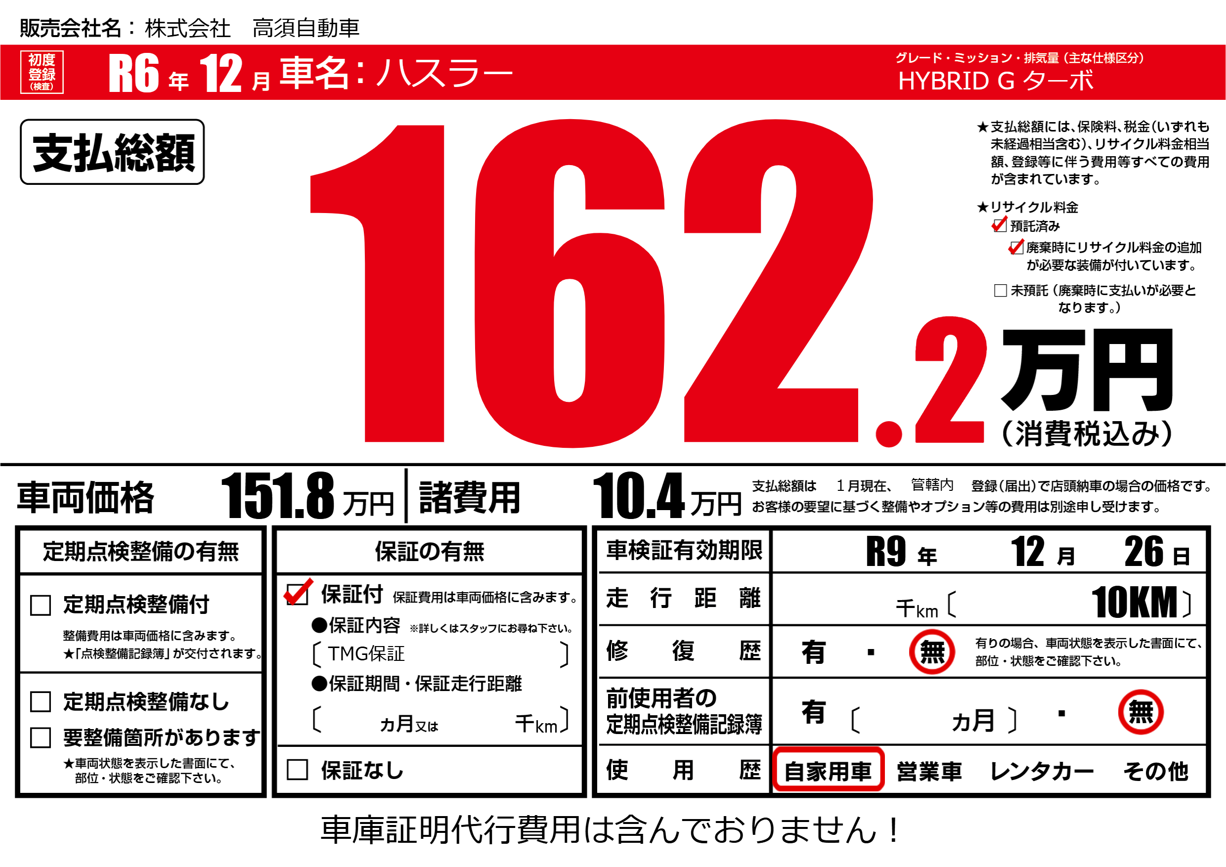なし | 車検制限 | R9年12月26月 |