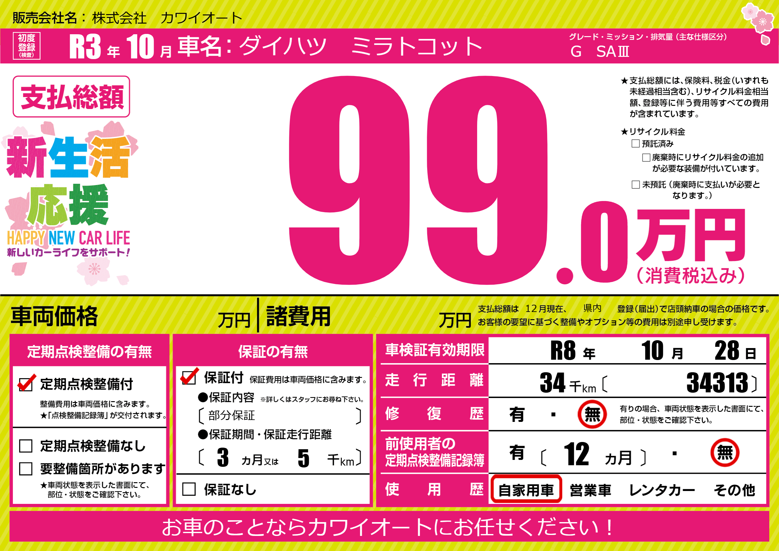 保証付き 保証内容(部分保証) 3ヶ月または(5)千kmまで |