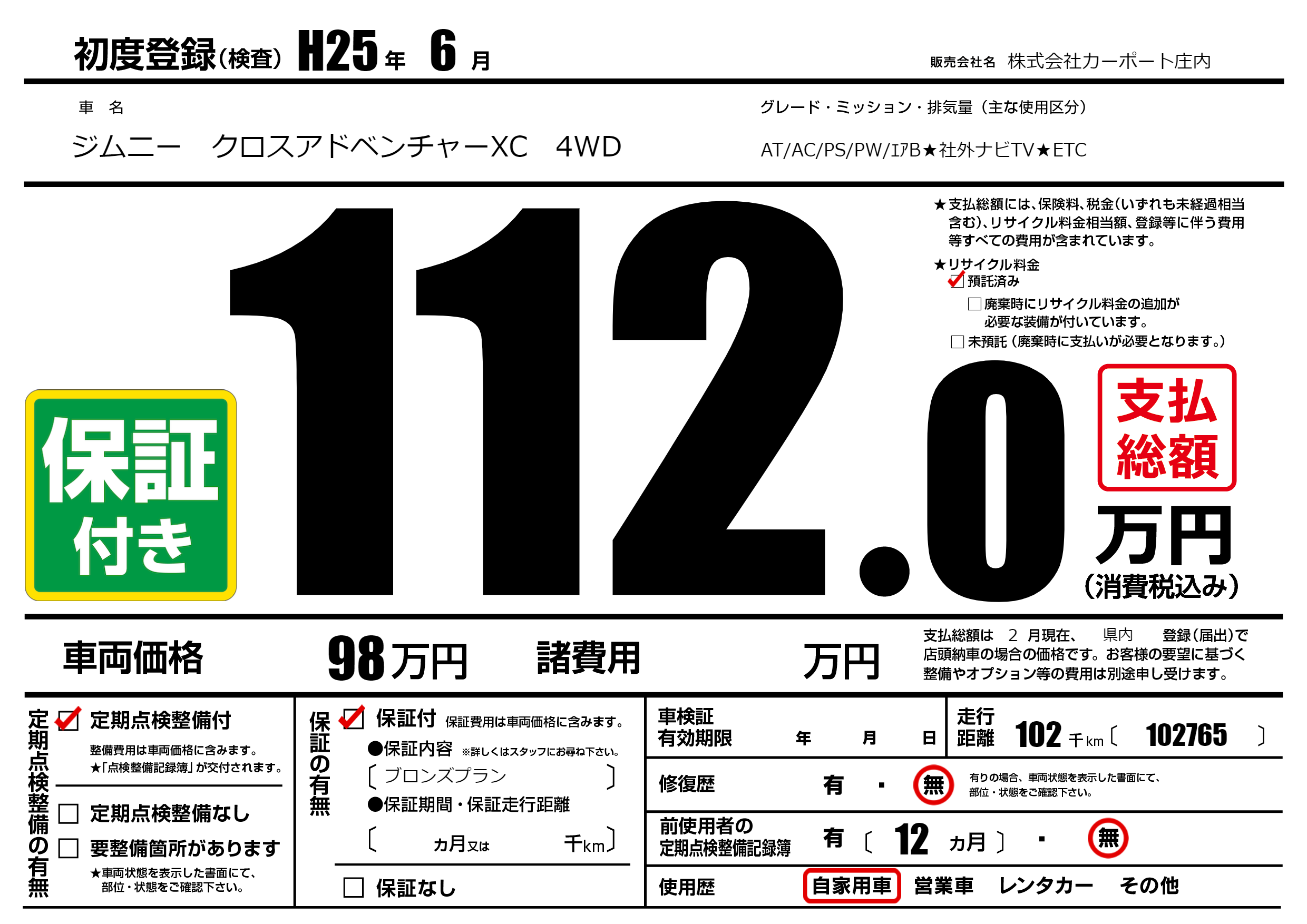 | 車名 | ジムニー クロスアドベンチャーXC 4WD | グレード ミッション 排気量 |