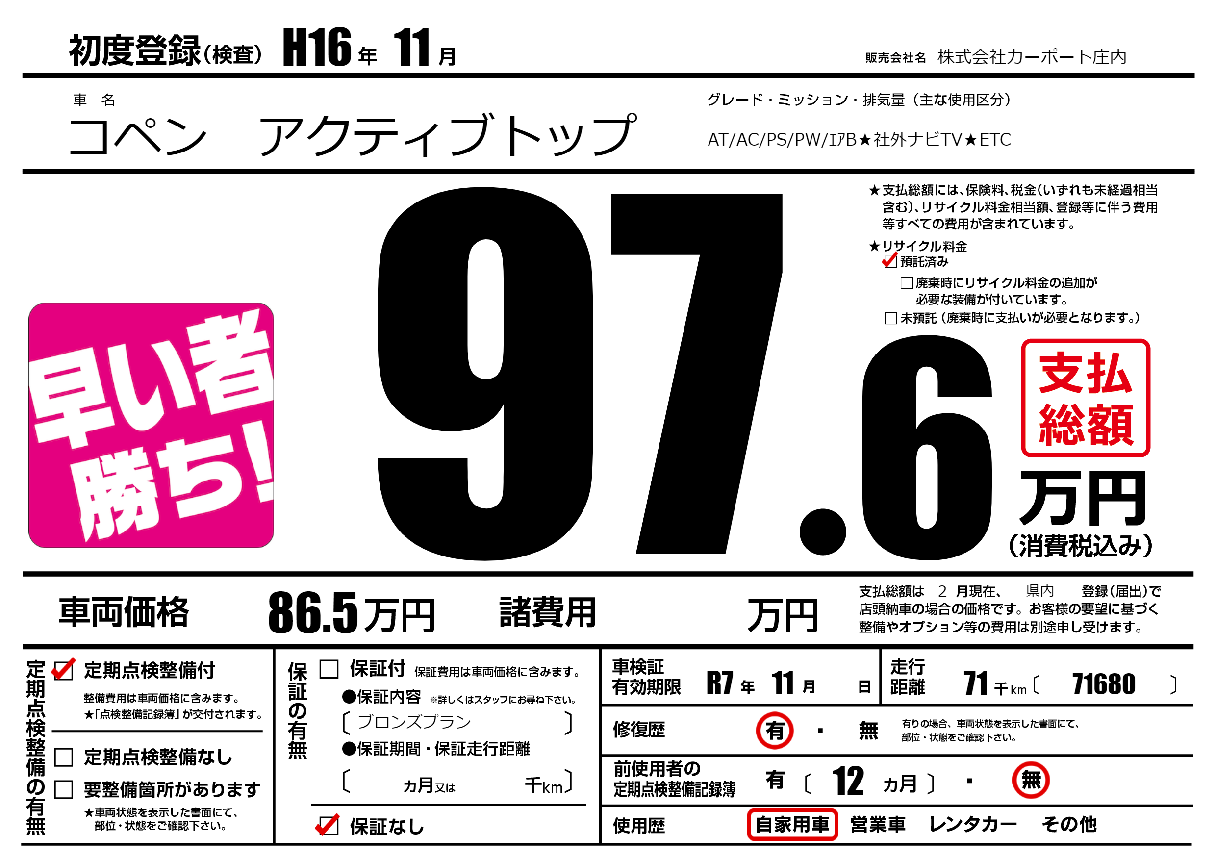 | 車名 | コペン アクティブトップ | グレード ミッション 排気量 |