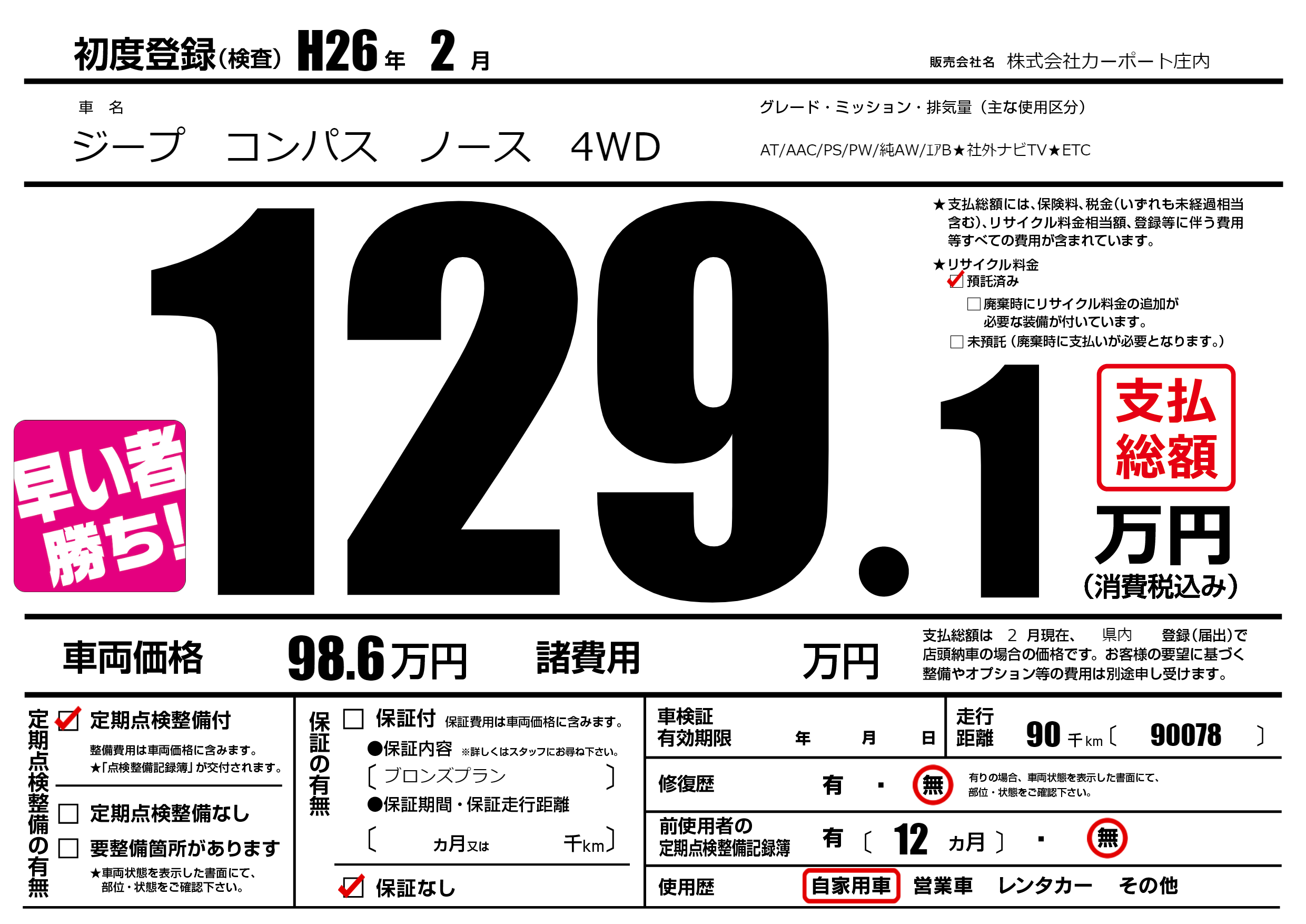 | 車名 | ジープ コンパス ノース 4WD | グレード ミッション 排気量 |