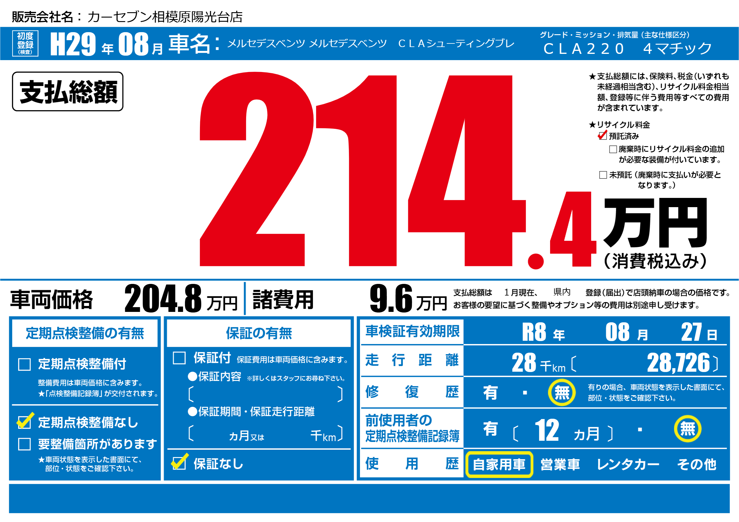 | 車名 | メルセデスベンツ メルセデスベンツ CLAシューティングブレ | グレード ミッション 排気量 |