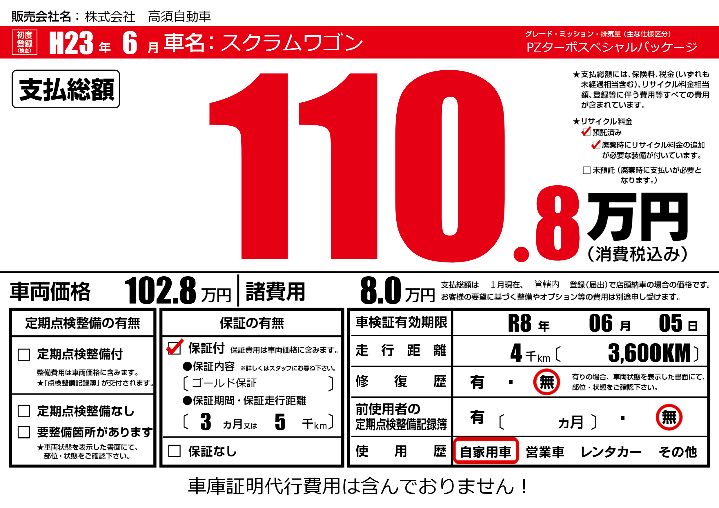 | 走行キロ | 0.4万km | 初年度登録 | H23年6月 |