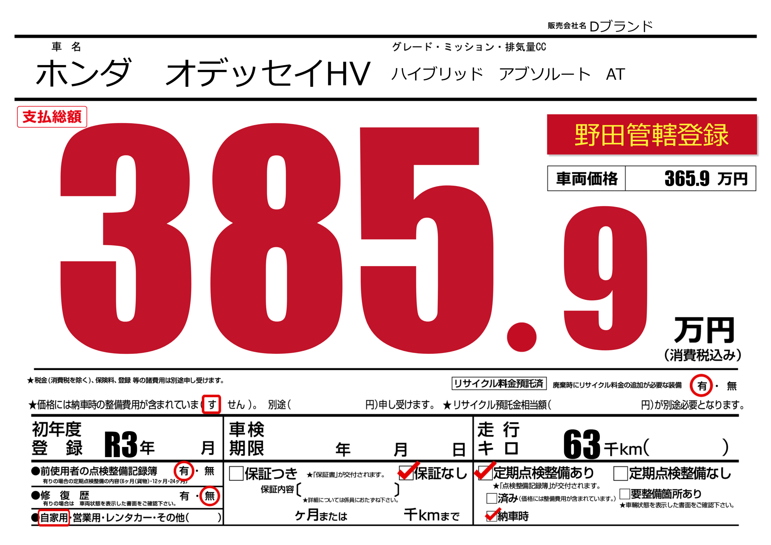| 車名 | ホンダ オデッセイHV | グレード ミッション 排気量 |