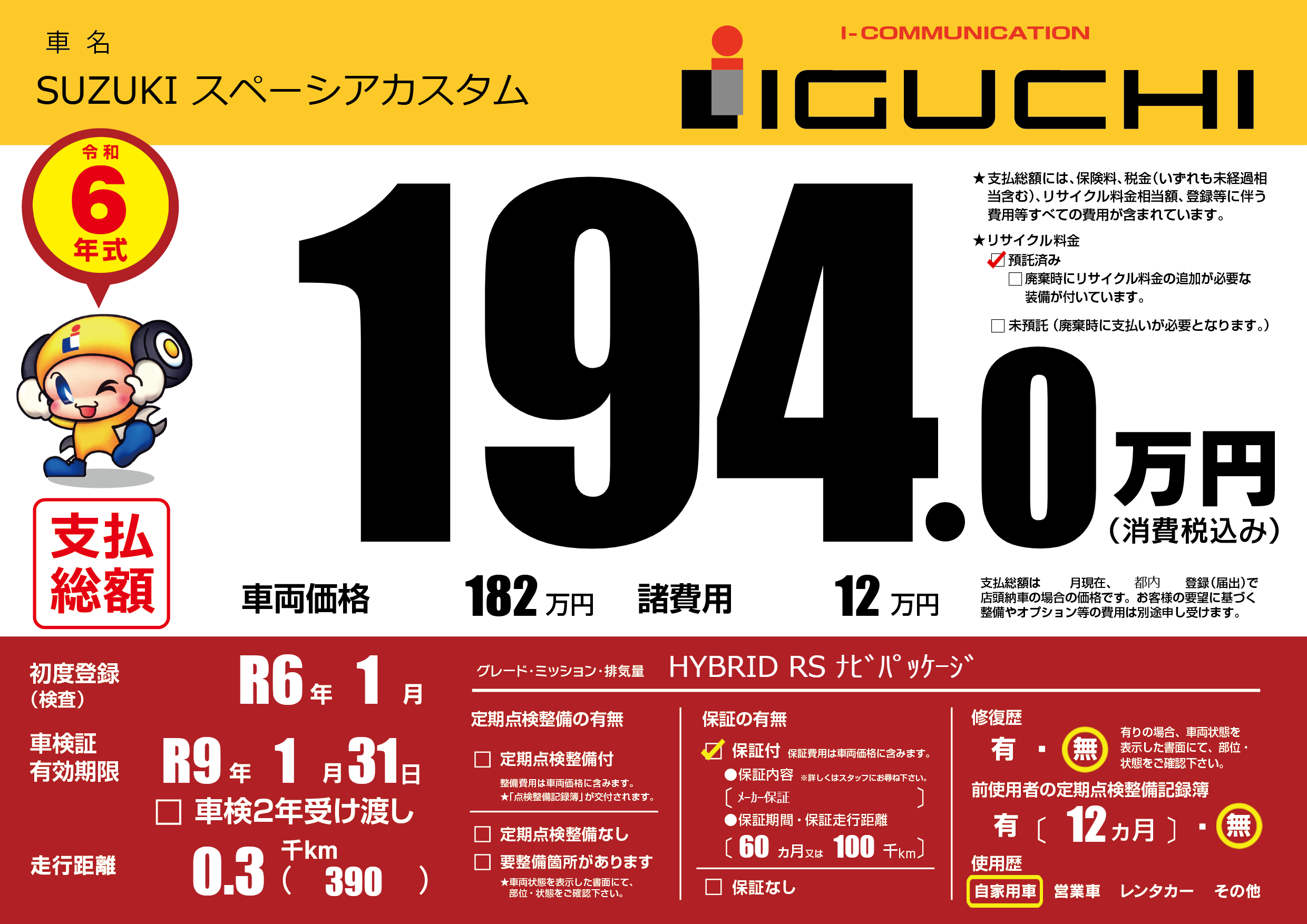 | 車名 | SUZUKI スペーシアカスタム | グレード ミッション 排気量 |