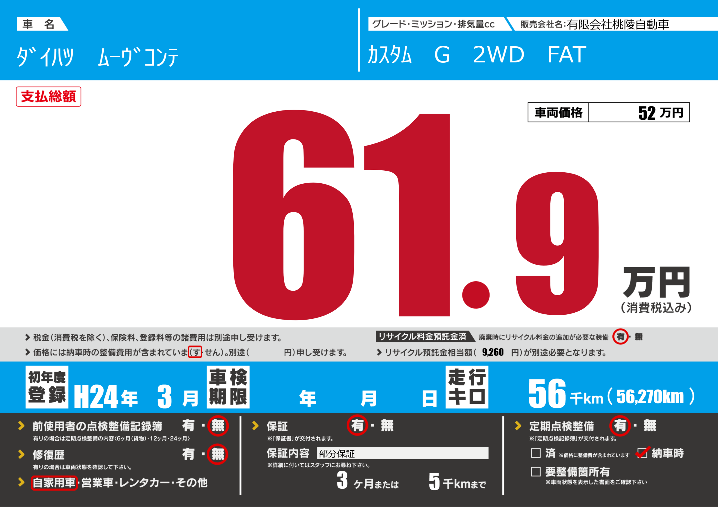 | 車名 | ダイハツ ムーヴコンテ | グレード ミッション 排気量 |
