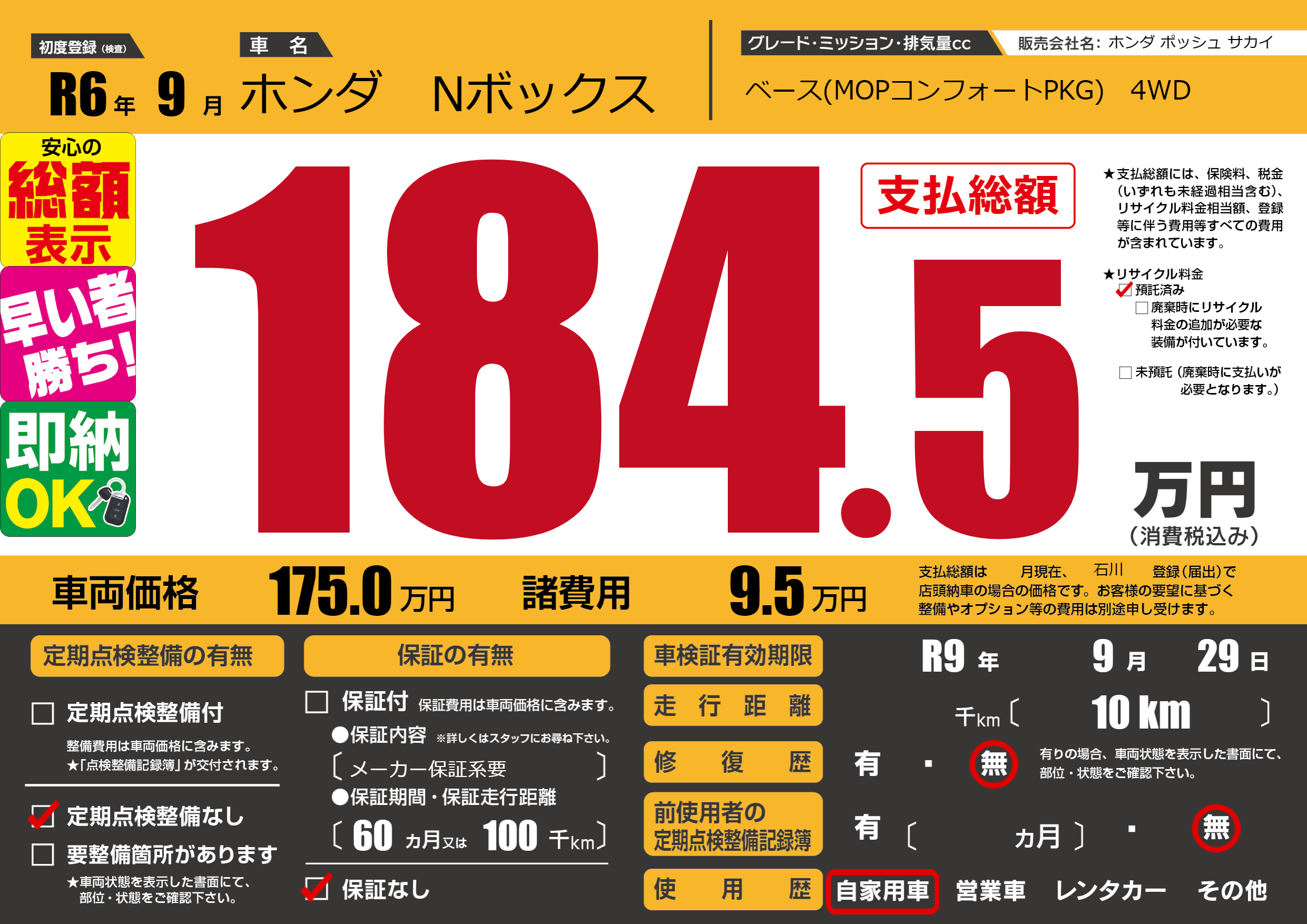 | 走行キロ | - | 初年度登録 | R6年9月 |