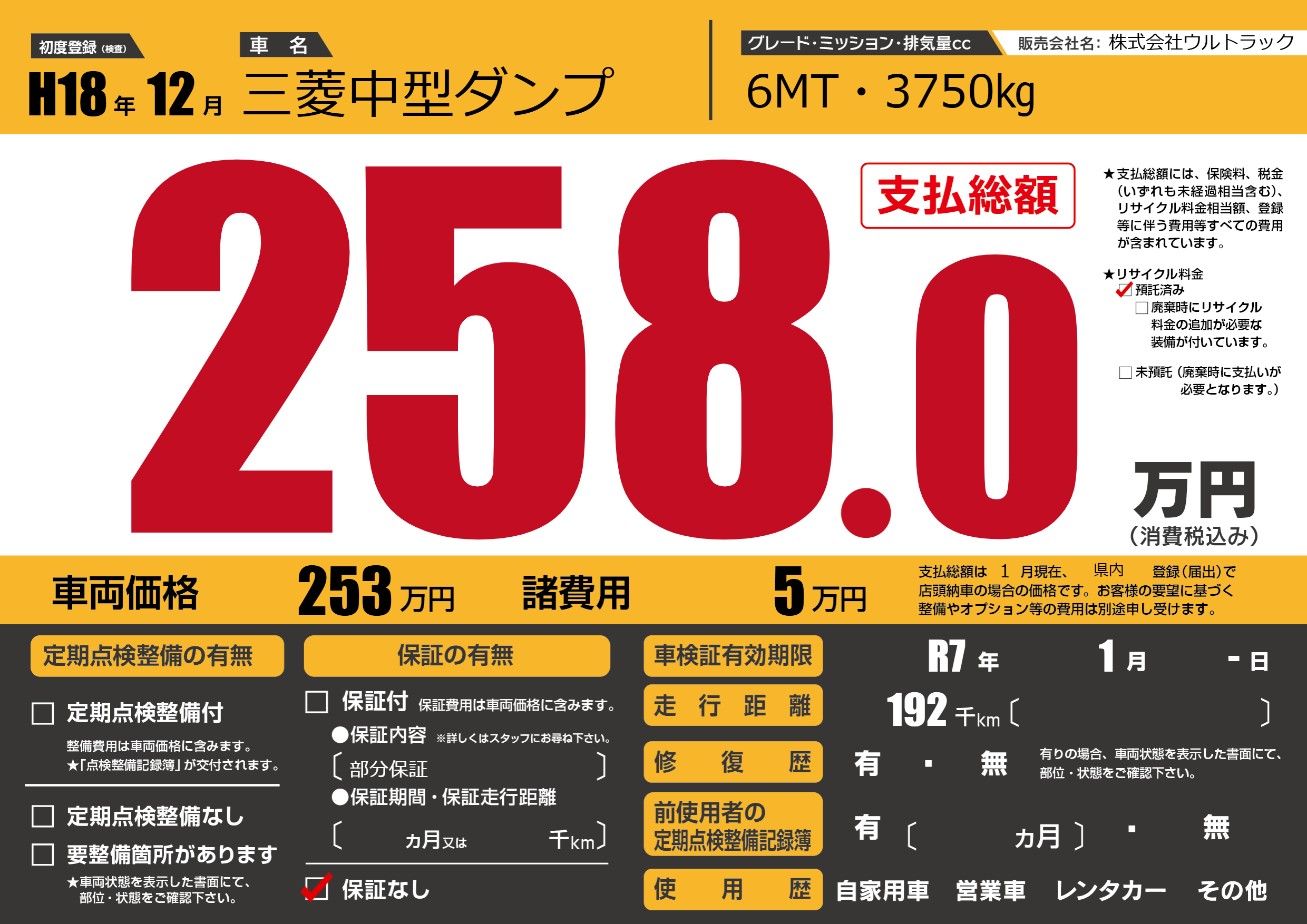 | 走行キロ | 19.2万km | 初年度登録 | H18年12月 |
