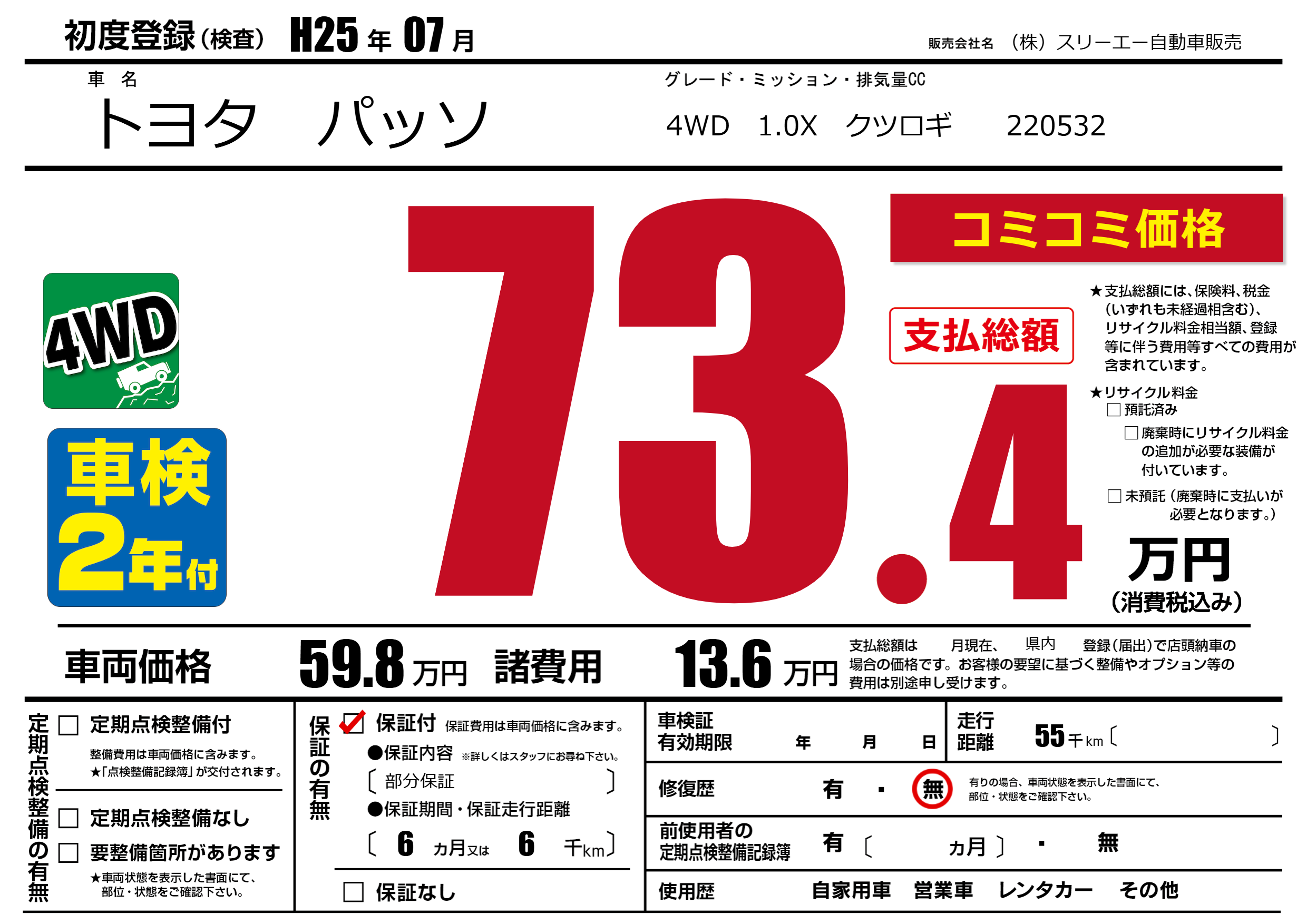 保証付き 保証内容(部分保証) 6ヶ月または(6)千kmまで |