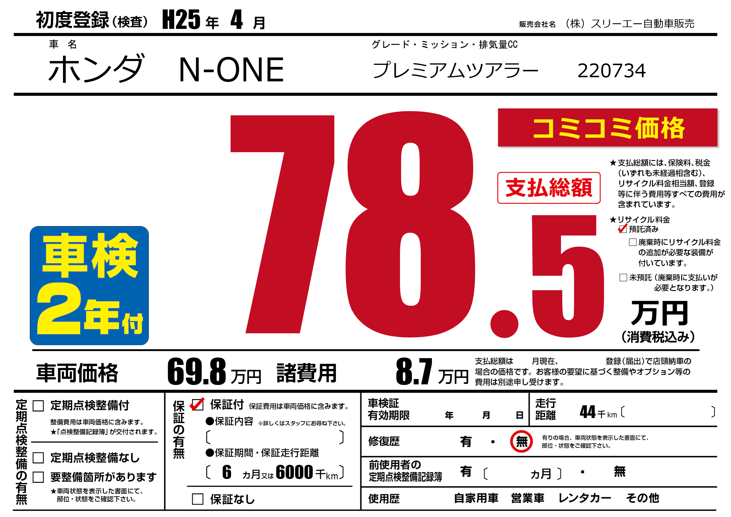| 車名 | ホンダ N-ONE | グレード ミッション 排気量 |
