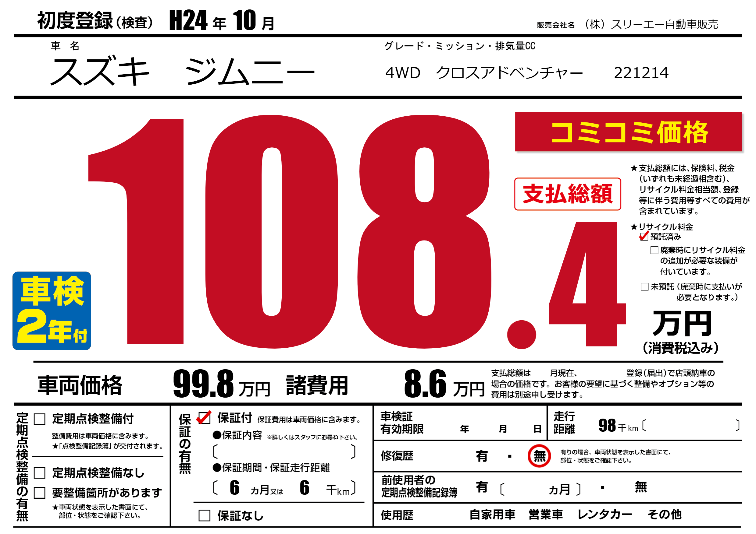 | 車名 | スズキ ジムニー | グレード ミッション 排気量 |