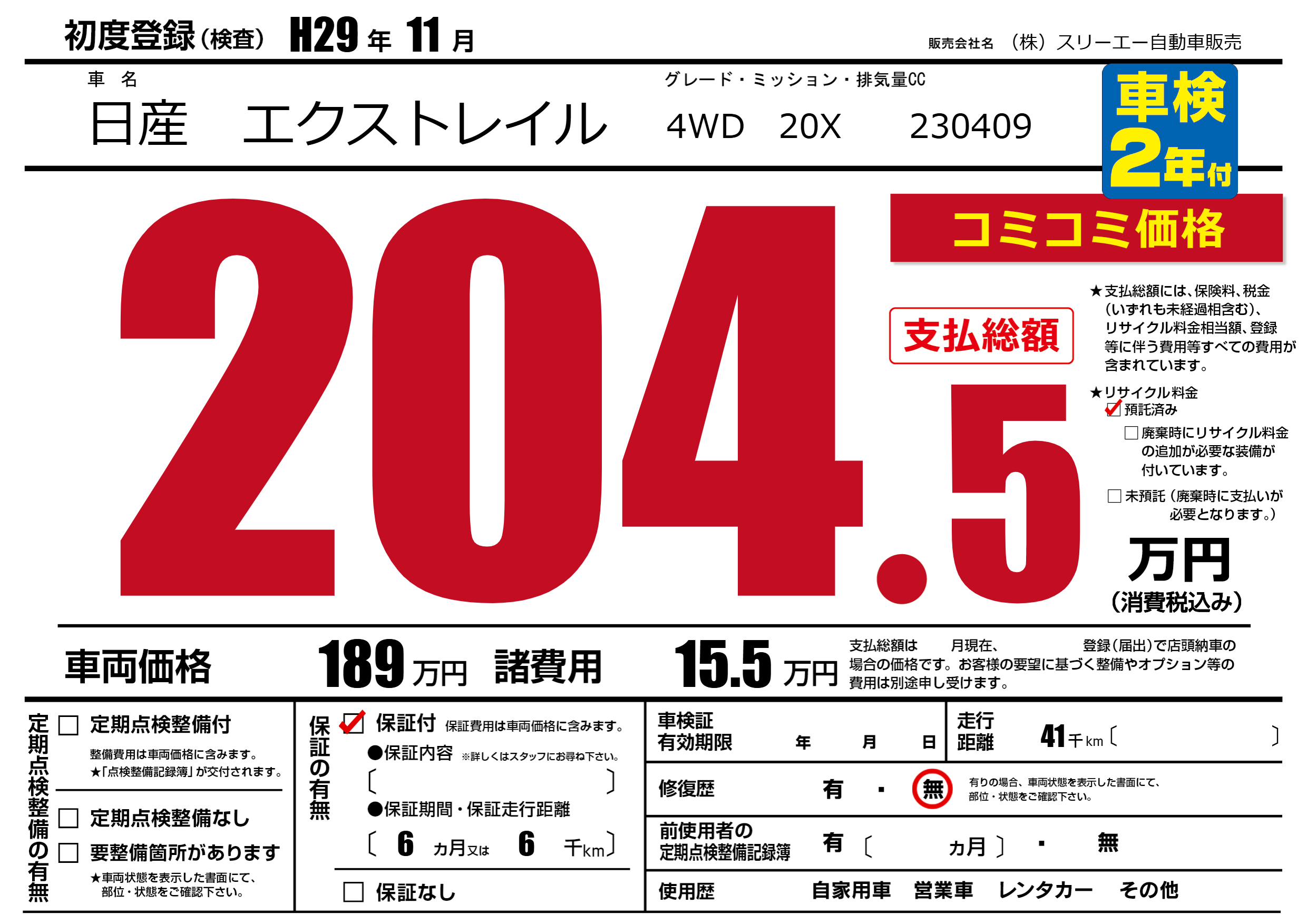 | 走行キロ | 4.1万km | 初年度登録 | H29年11月 |