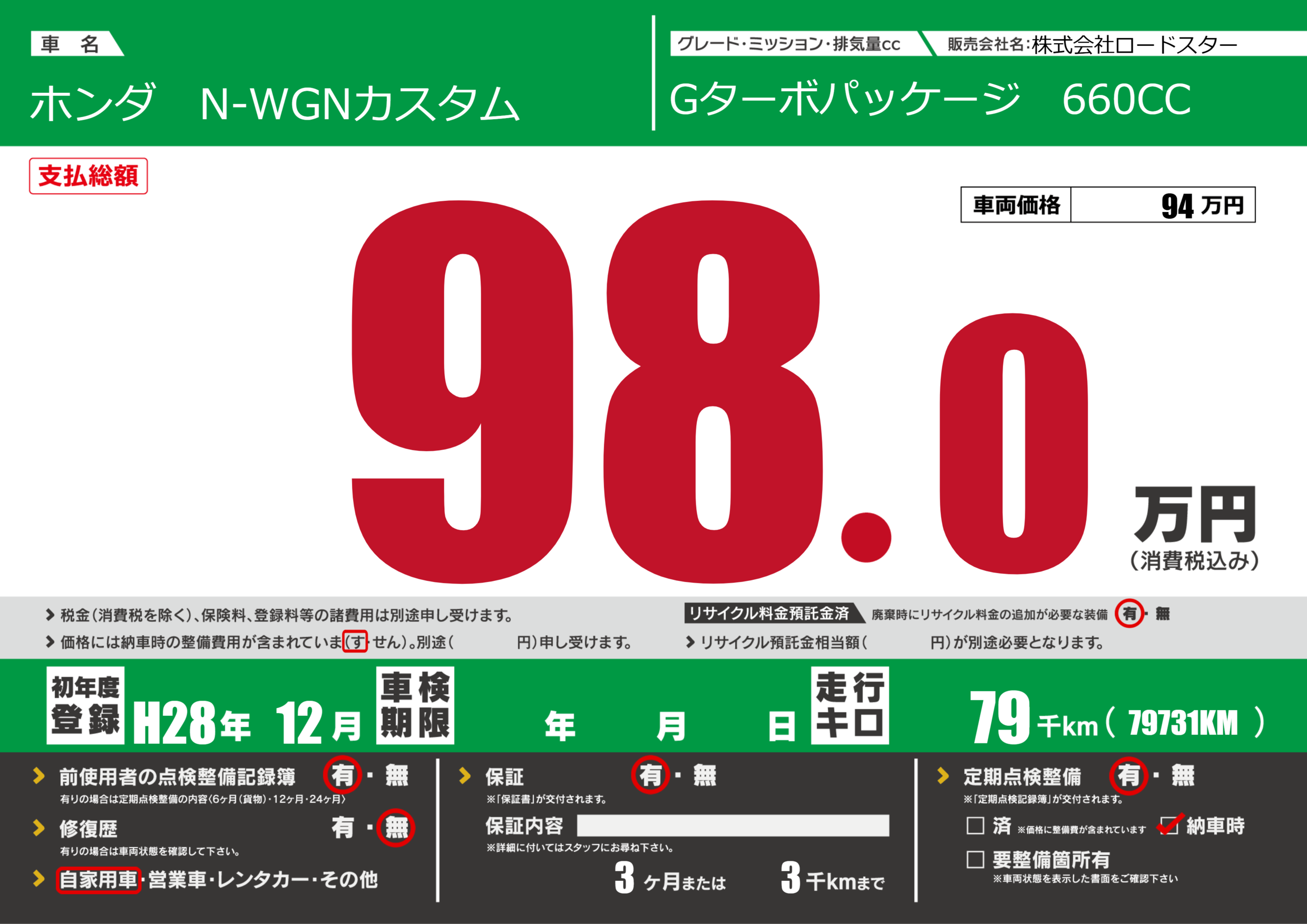 | 定期点検整備 | 定期点検整備あり 納車時あり | ||