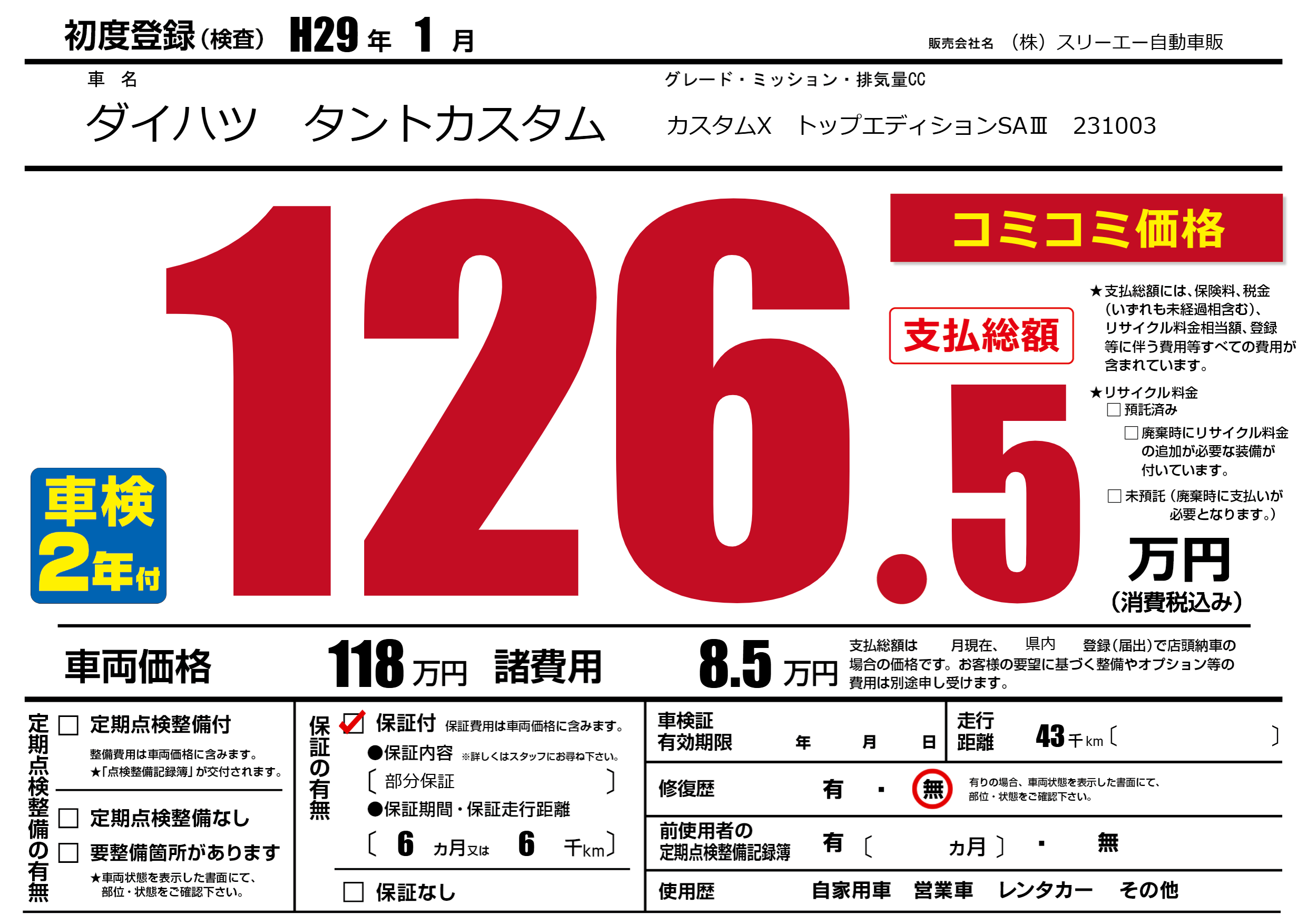保証付き 保証内容(部分保証) 6ヶ月または(6)千kmまで |