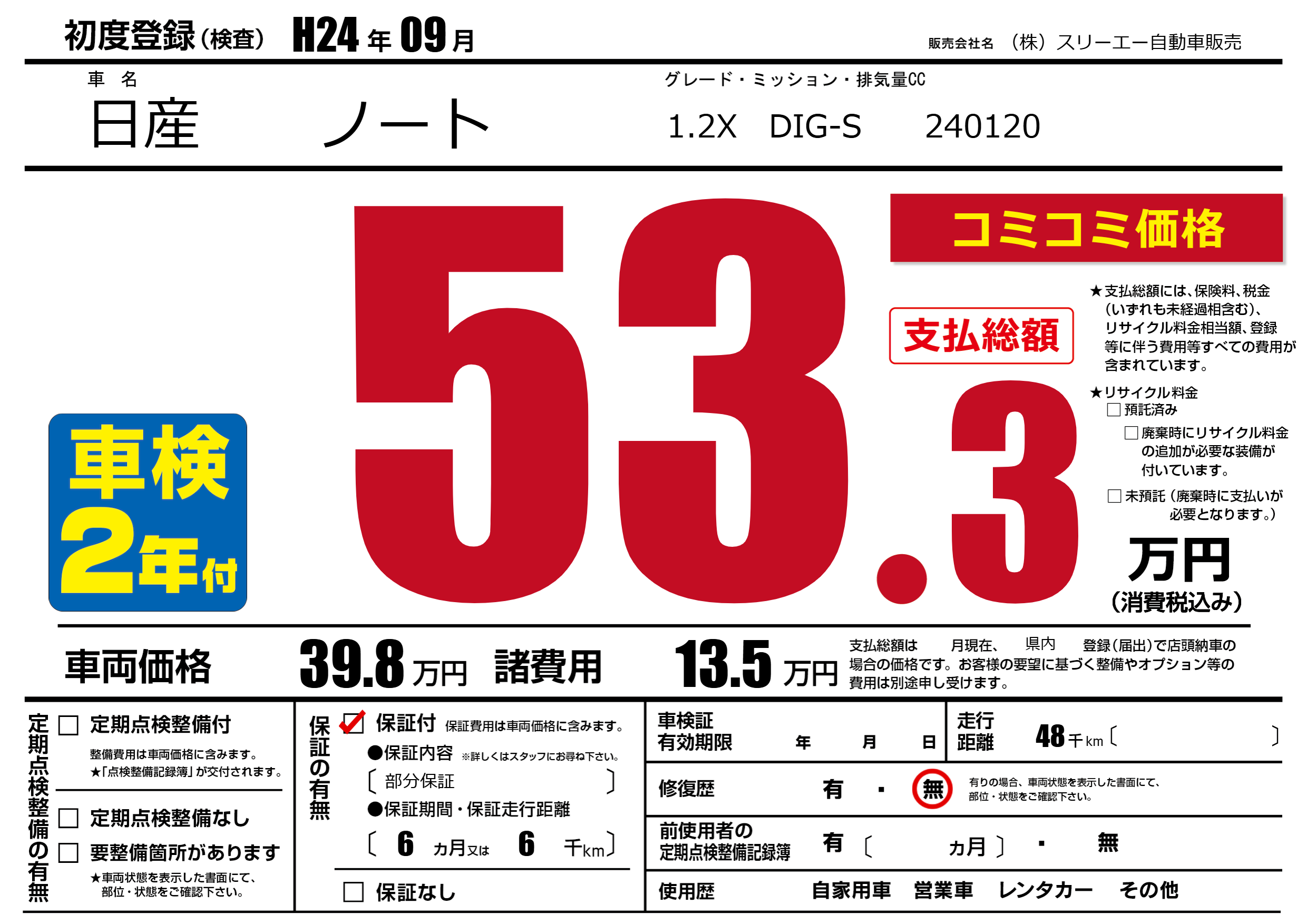 | 走行キロ | 4.8万km | 初年度登録 | H24年09月 |