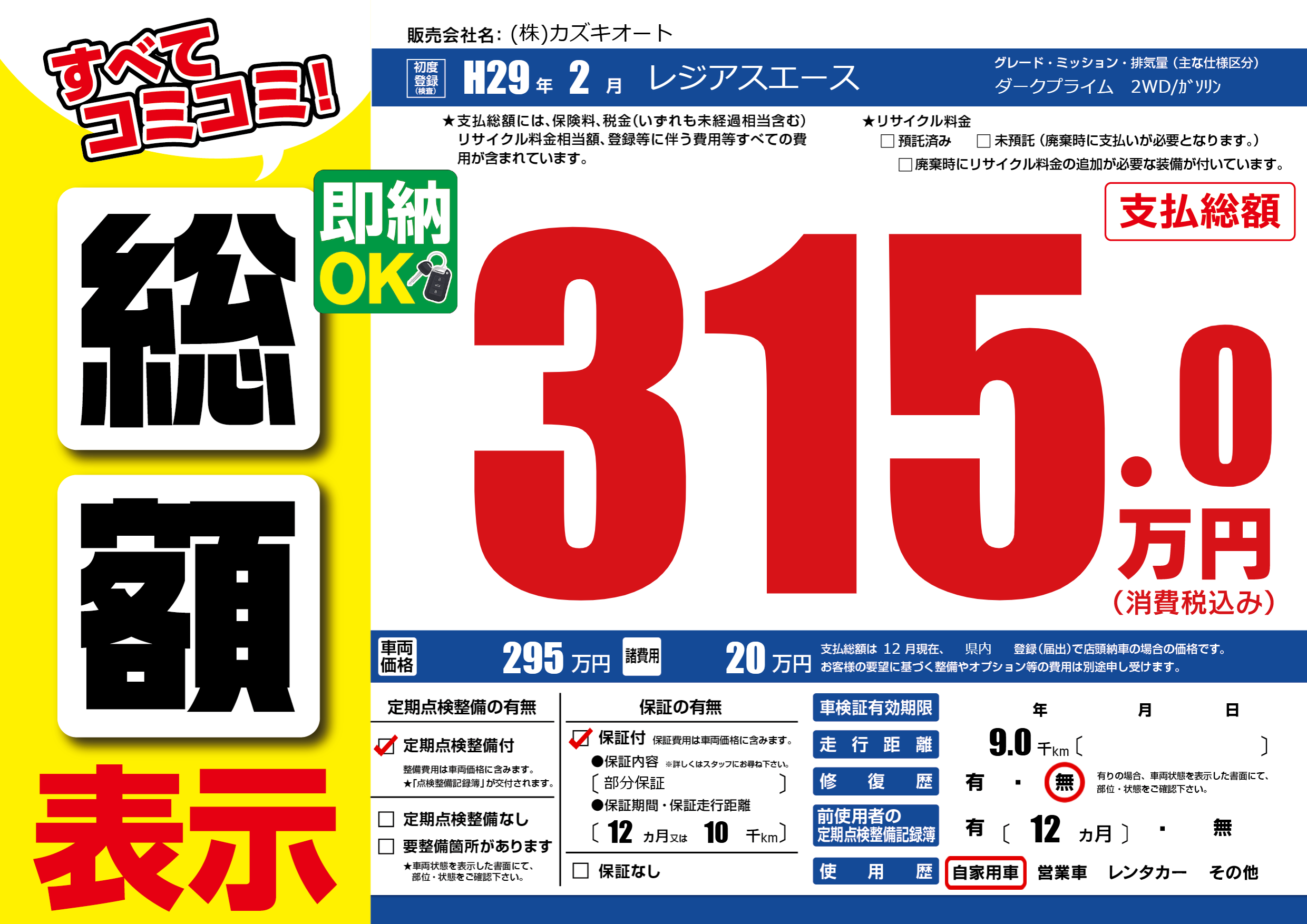 | 走行キロ | 0.9万km | 初年度登録 | H29年2月 |