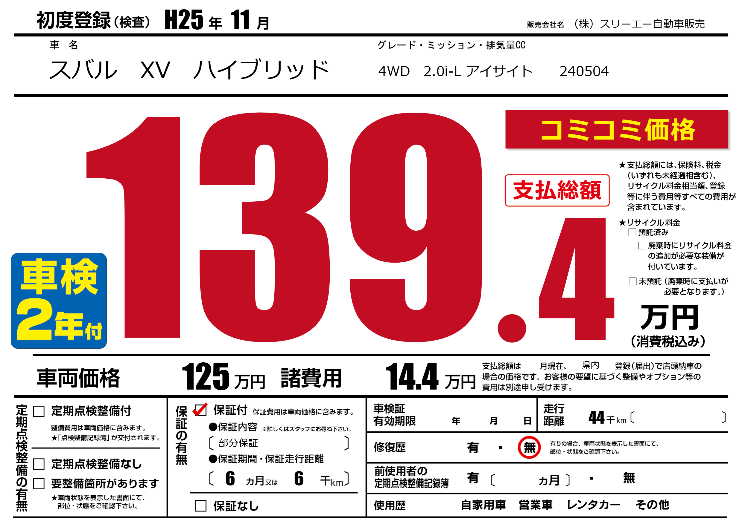 保証付き 保証内容(部分保証) 6ヶ月または(6)千kmまで |