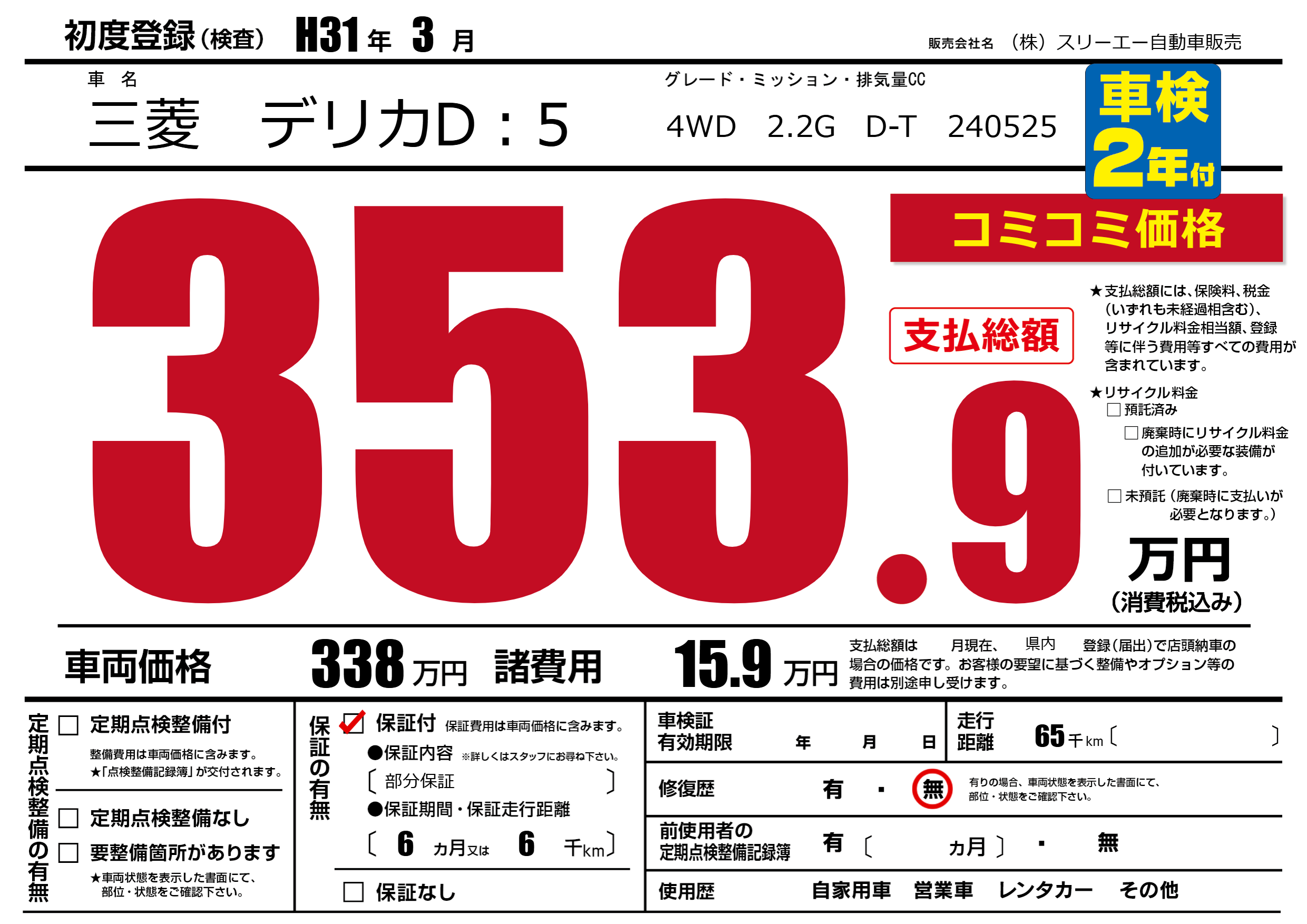 | 走行キロ | 6.5万km | 初年度登録 | H31年3月 |