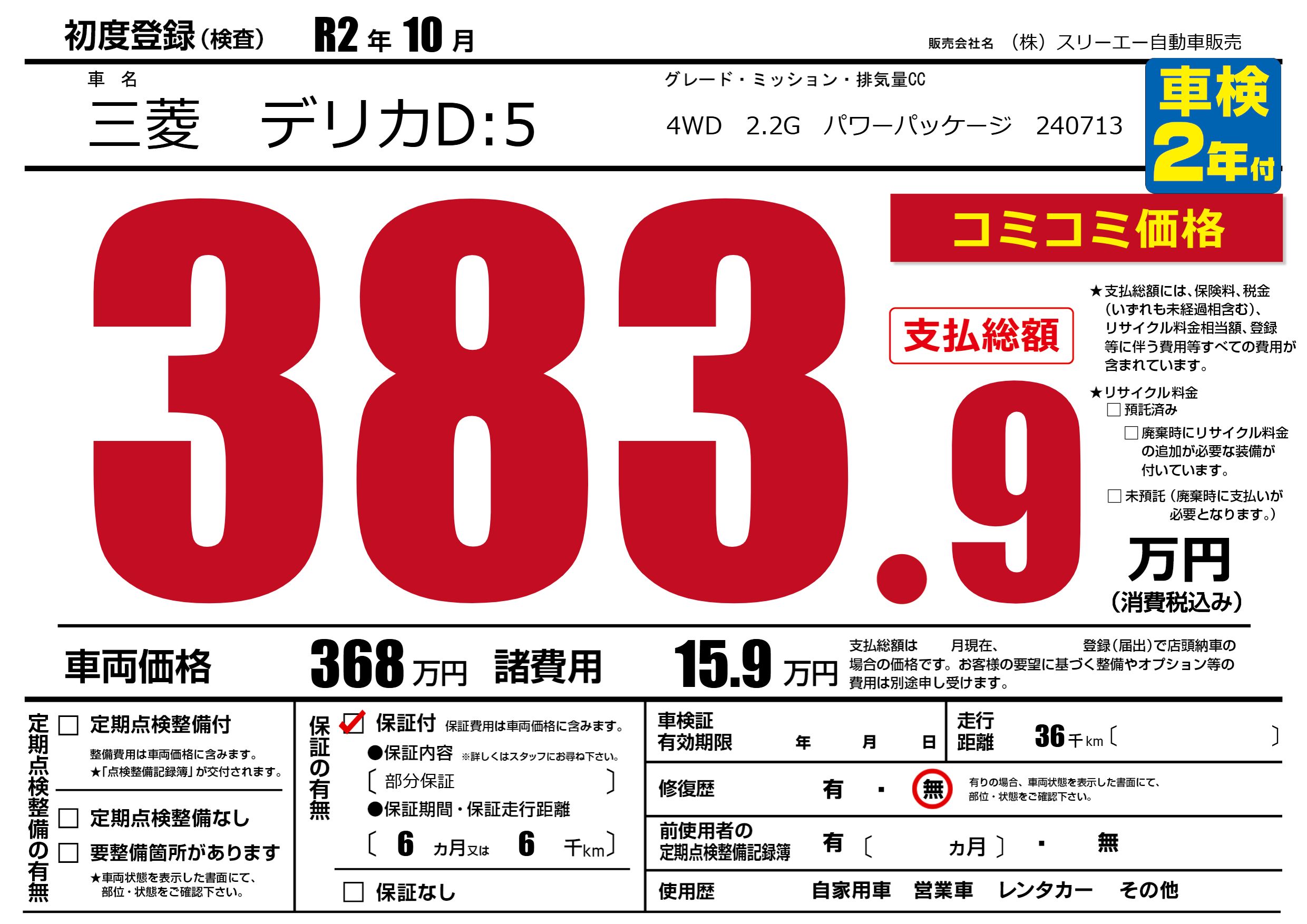| 車名 | 三菱 デリカD:5 | グレード ミッション 排気量 |