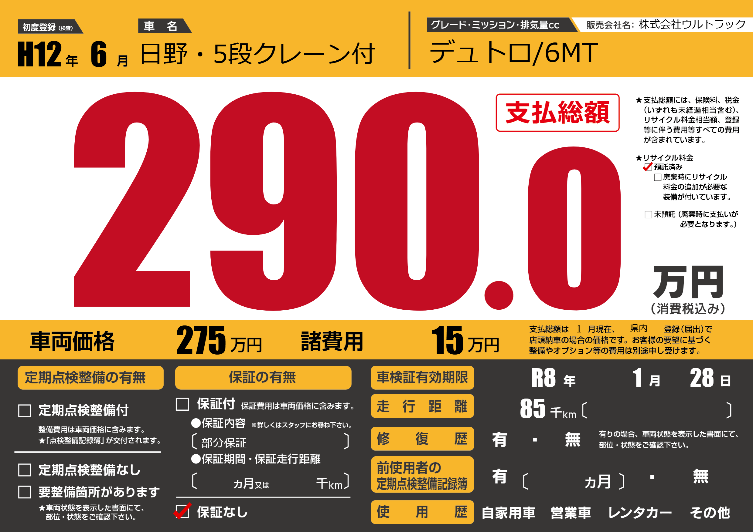 | 車名 | 日野・5段クレーン付 | グレード ミッション 排気量 |