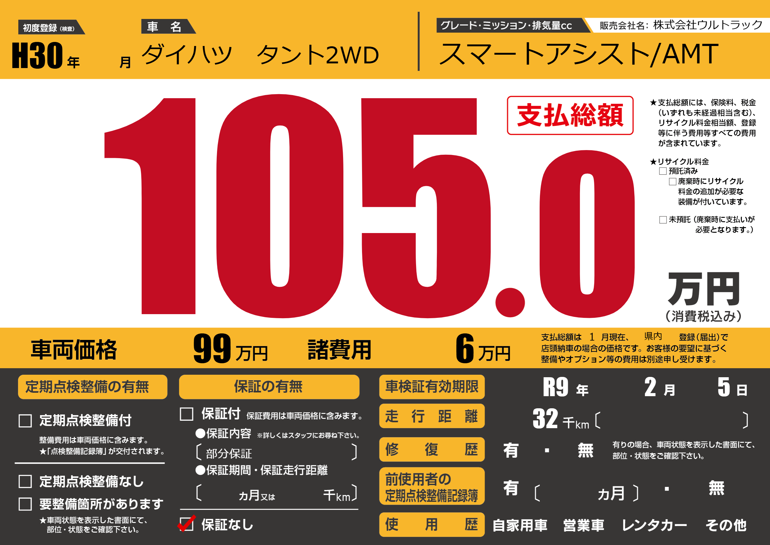 | 走行キロ | 3.2万km | 初年度登録 | H30年---月 |