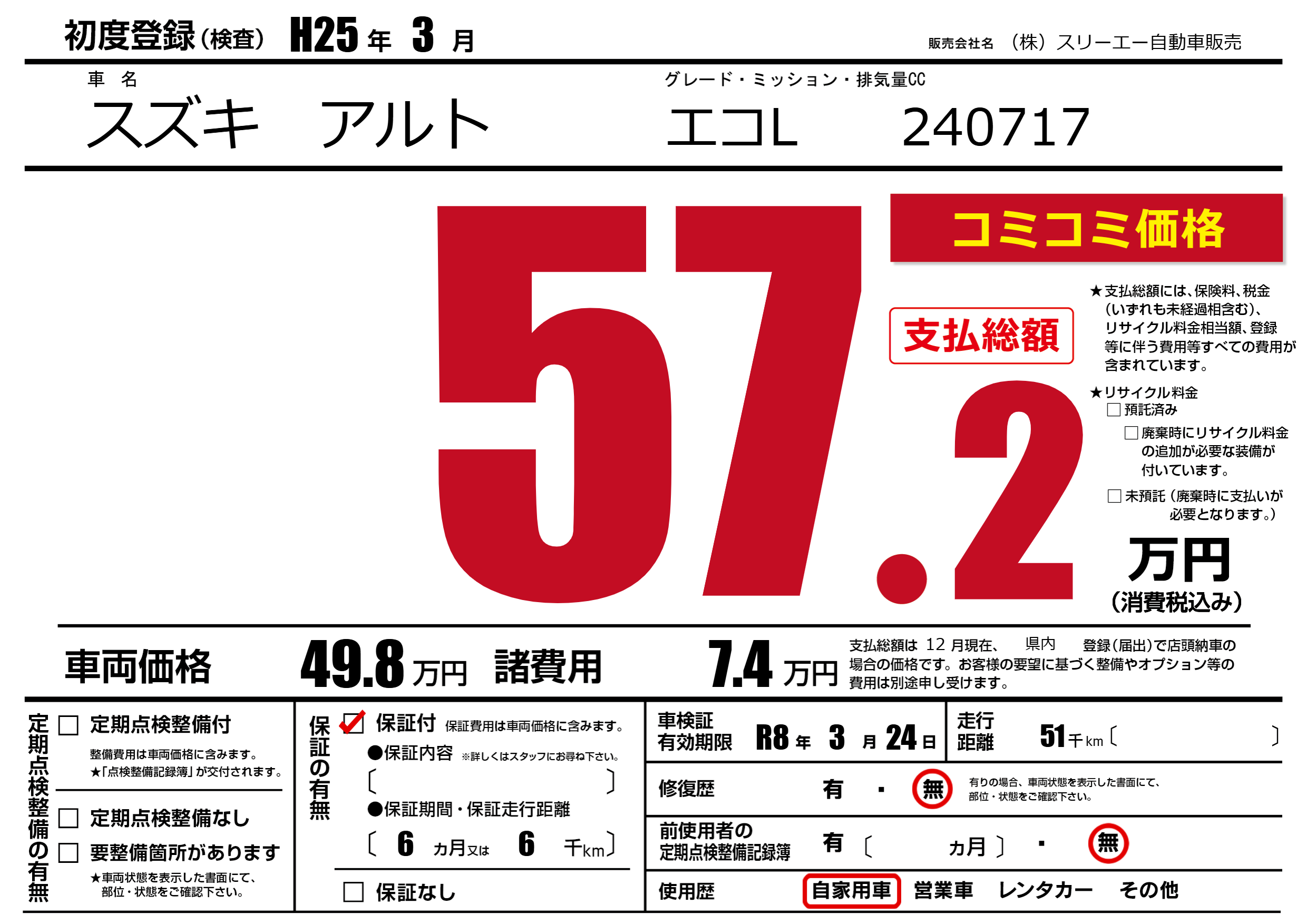 | 車名 | スズキ アルト | グレード ミッション 排気量 |