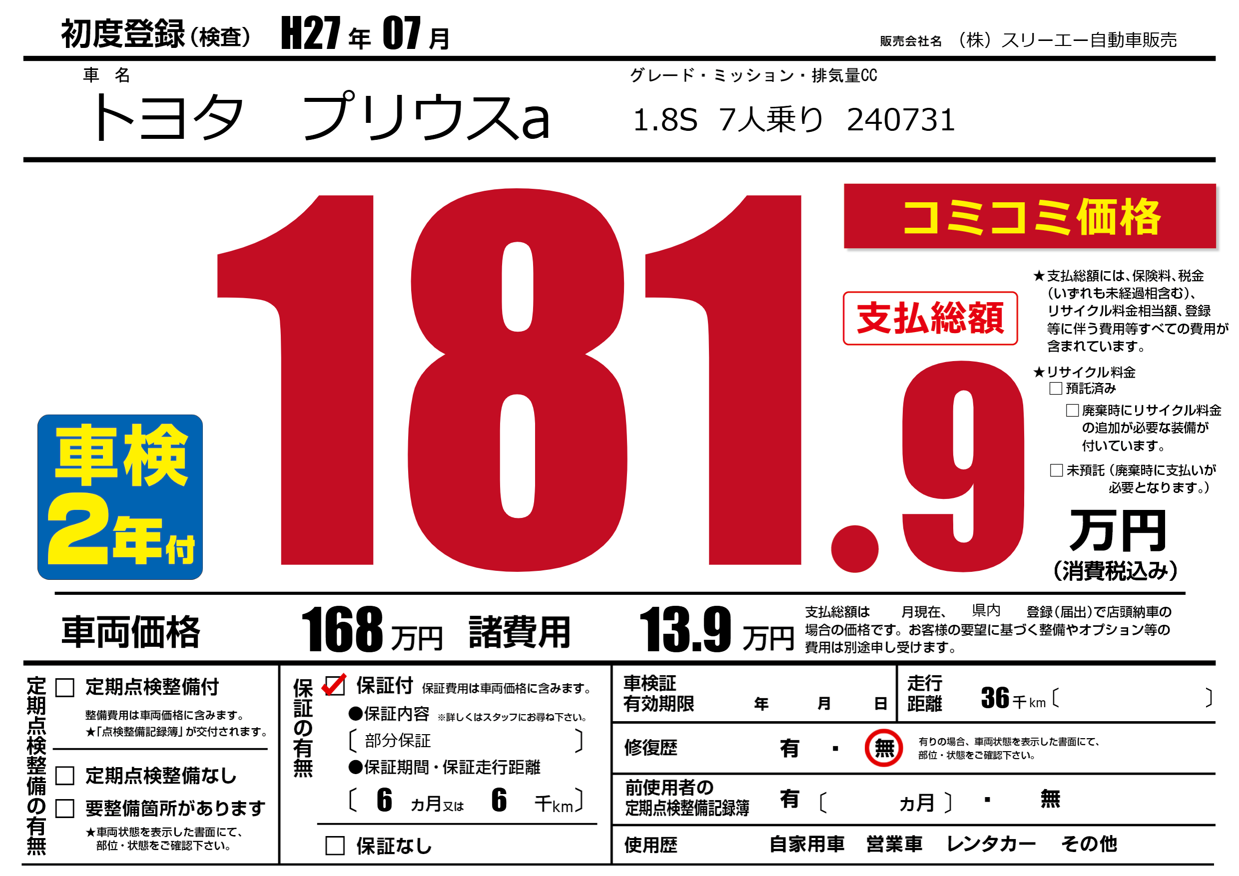 | 車名 | トヨタ プリウスa | グレード ミッション 排気量 |
