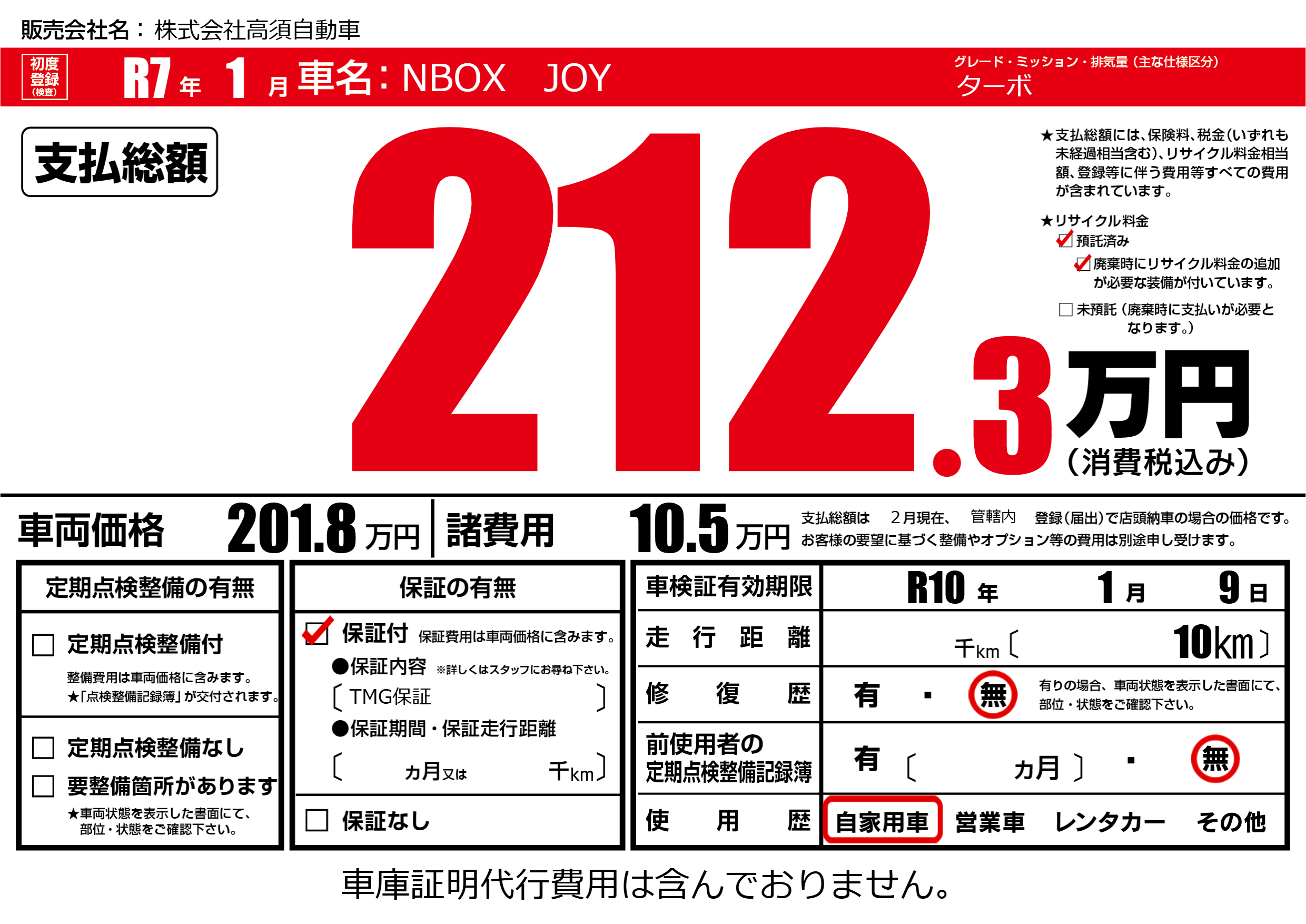 | 車名 | NBOX JOY | グレード ミッション 排気量 |