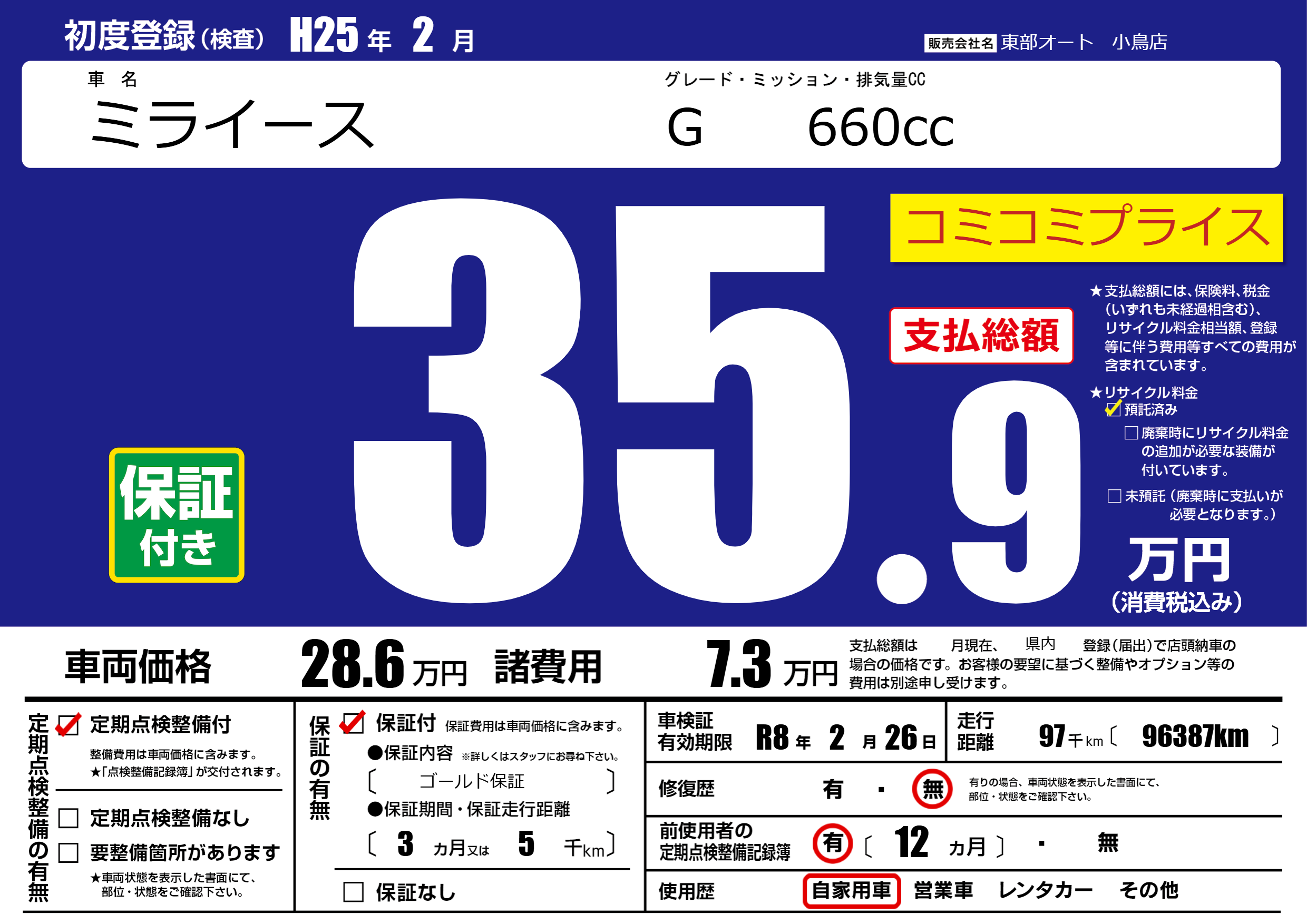 保証付き 保証内容( ゴールド保証) 3ヶ月または(5)千kmまで |