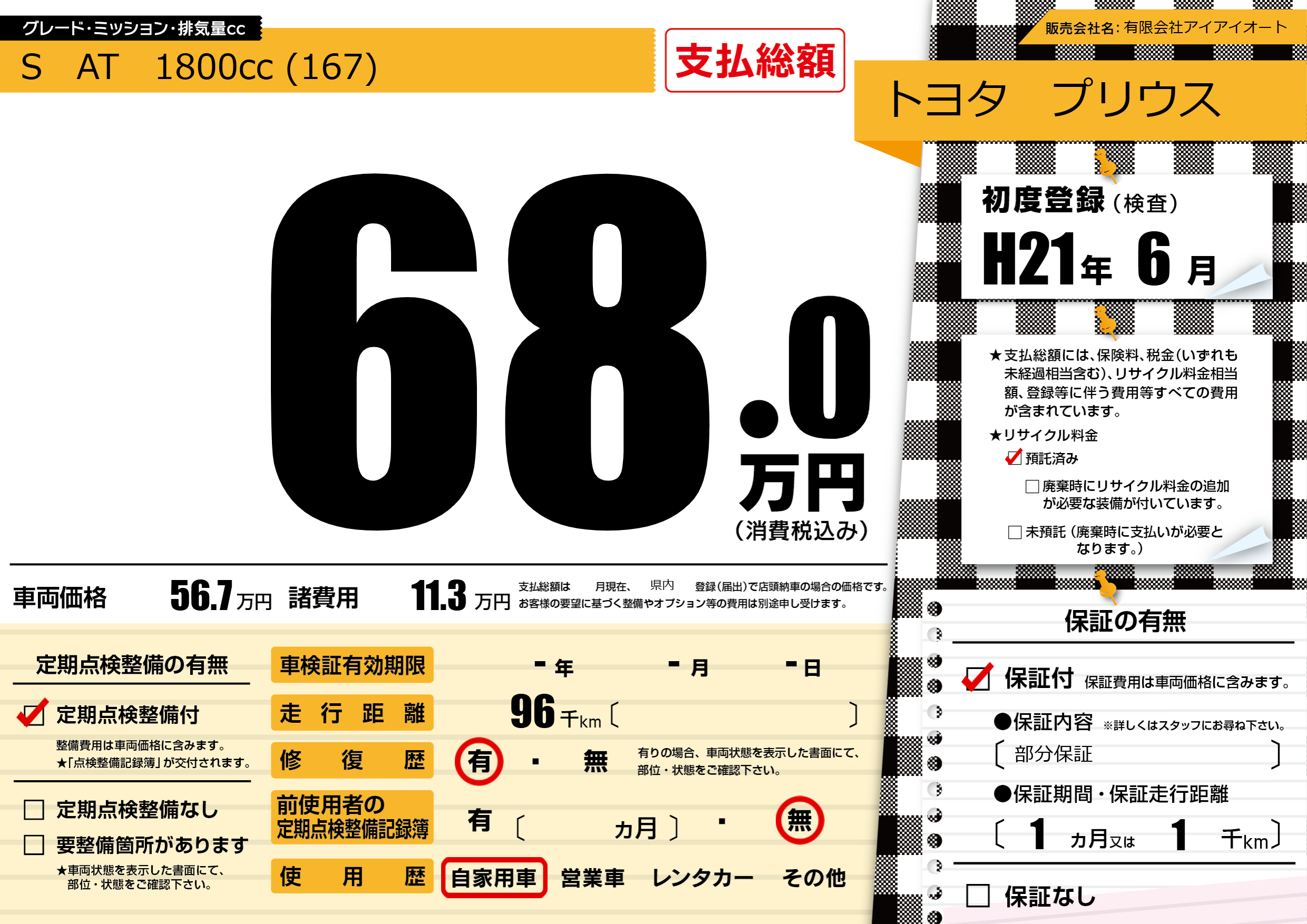 | 車名 | トヨタ プリウス | グレード ミッション 排気量 |