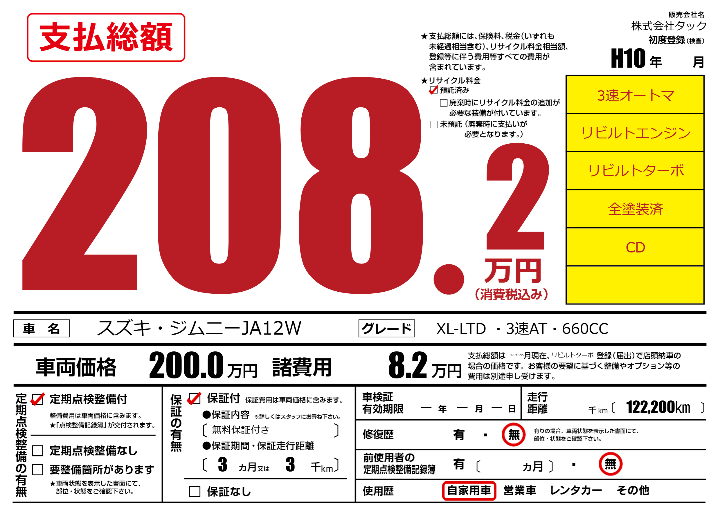 保証なし 保証内容(無料保証付き) 3ヶ月または(3)千kmまで |