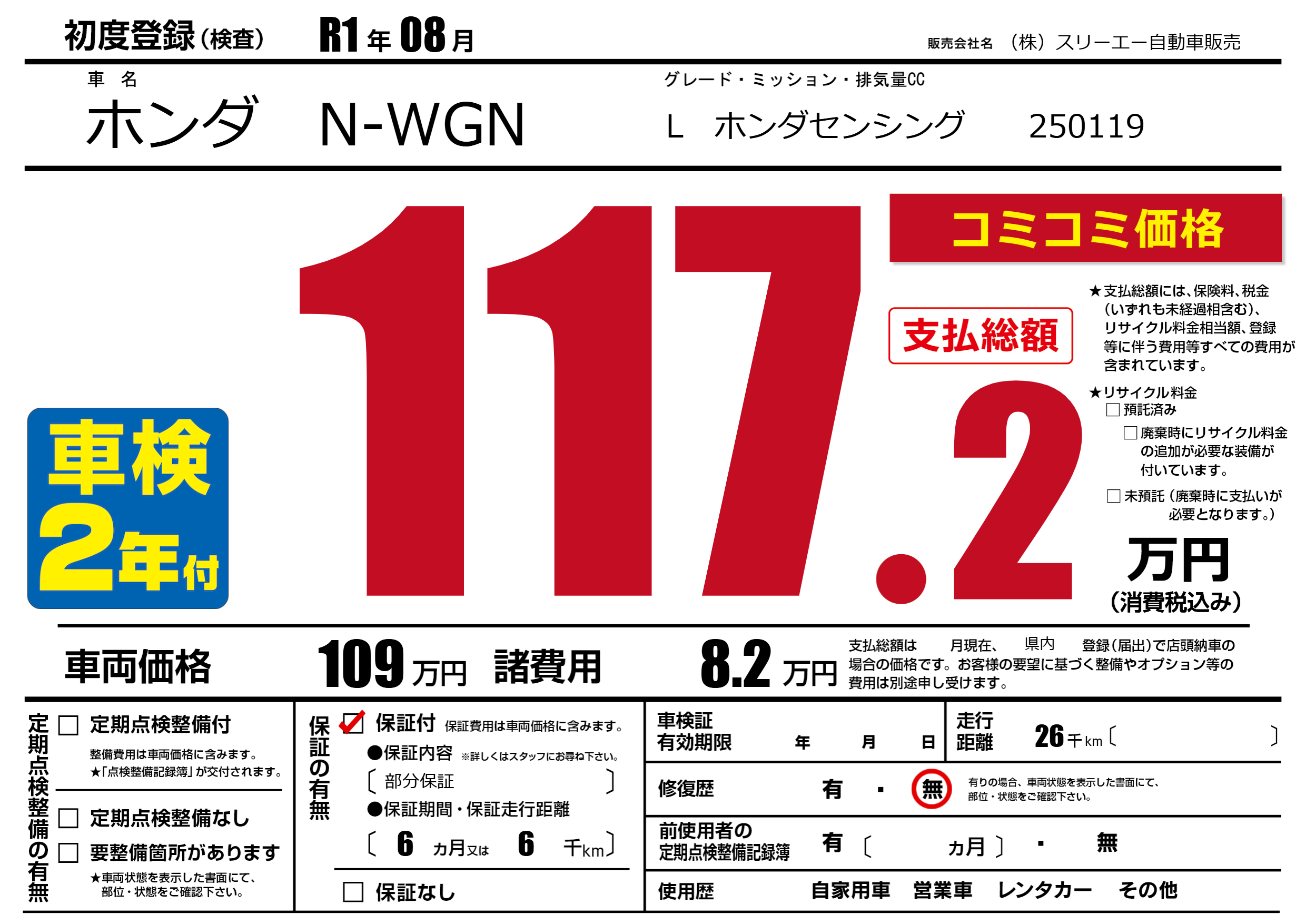 保証付き 保証内容(部分保証) 6ヶ月または(6)千kmまで |