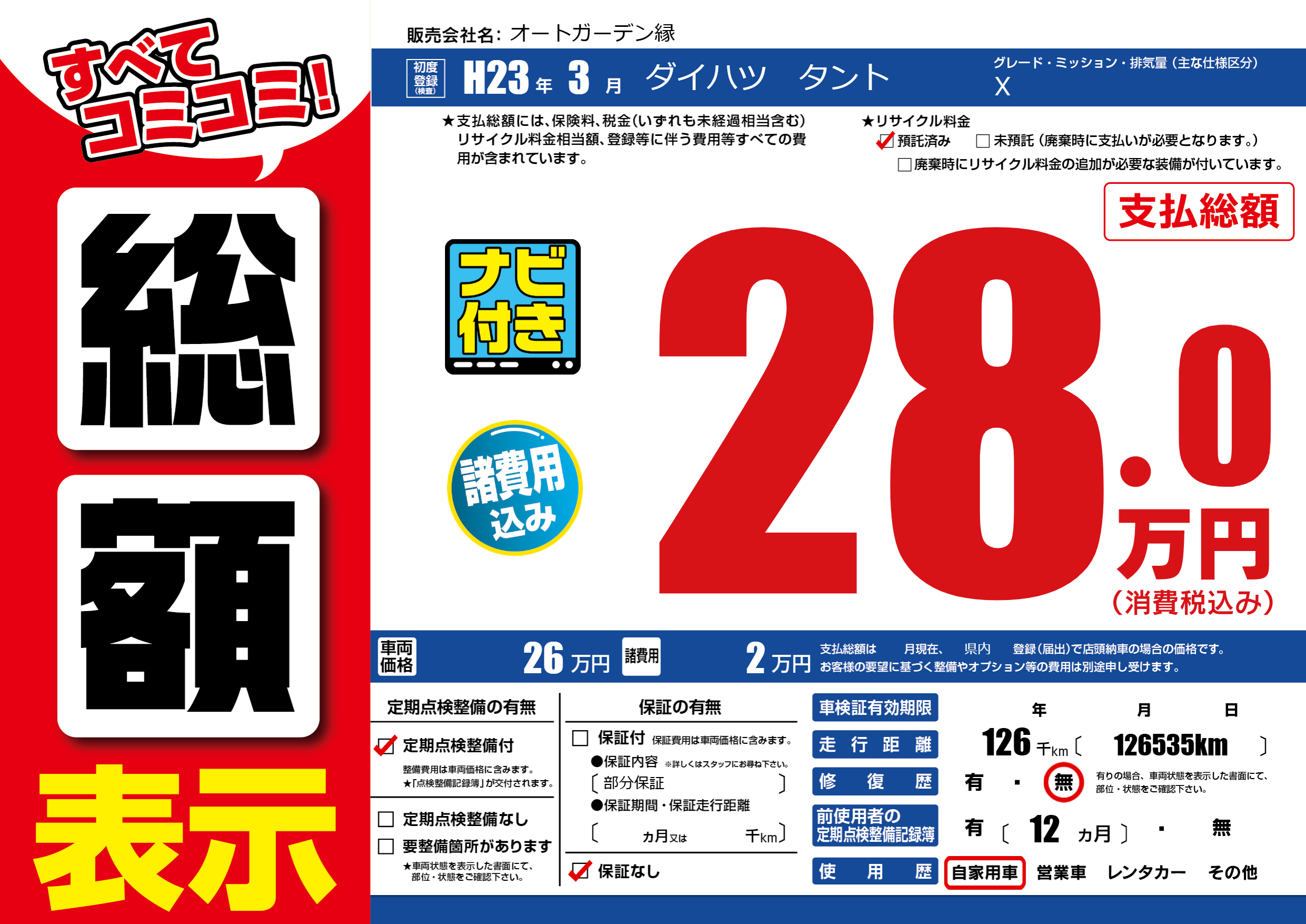| 走行キロ | 12.6万km | 初年度登録 | H23年3月 |
