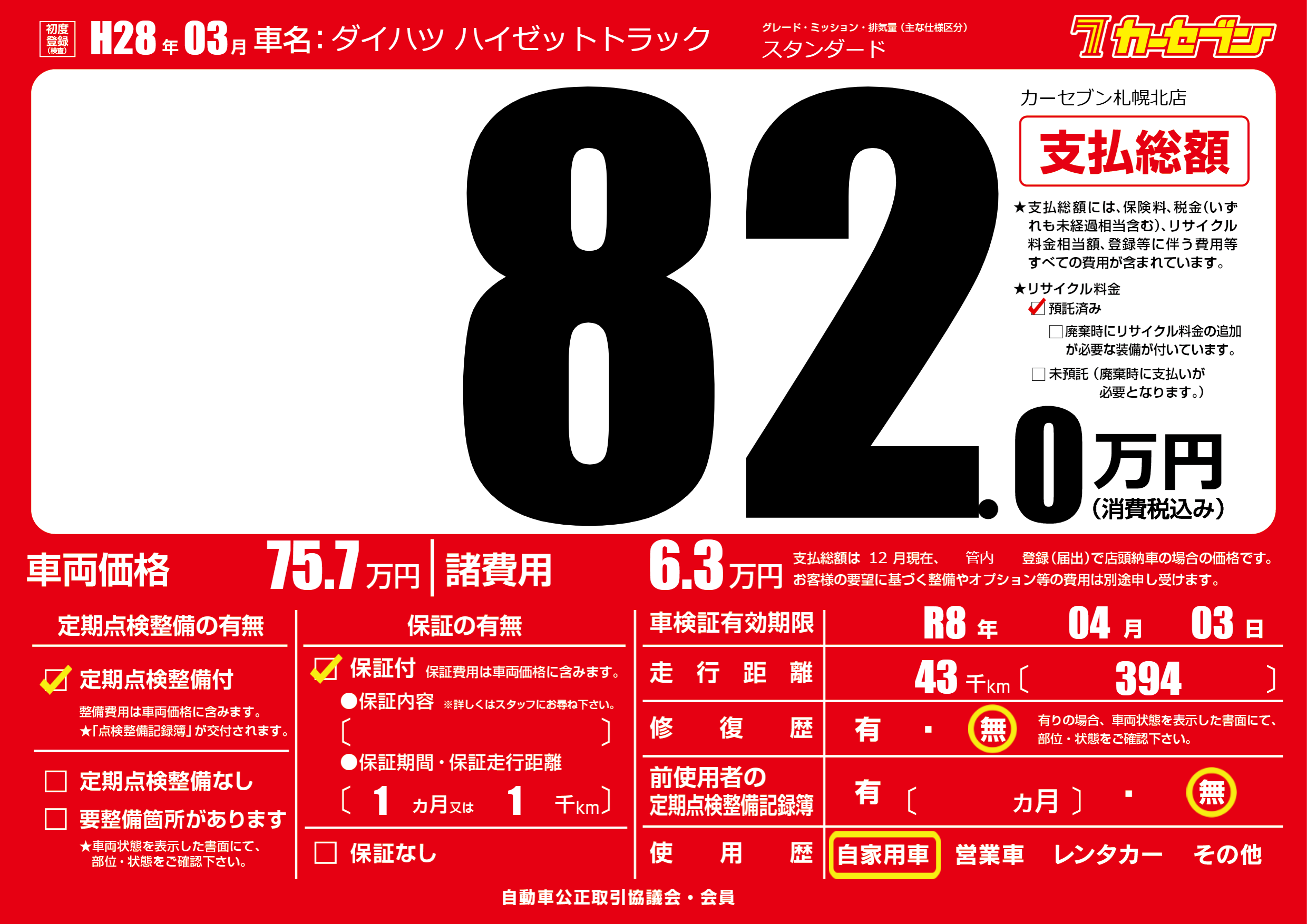 | 走行キロ | 4.3万km | 初年度登録 | H28年03月 |