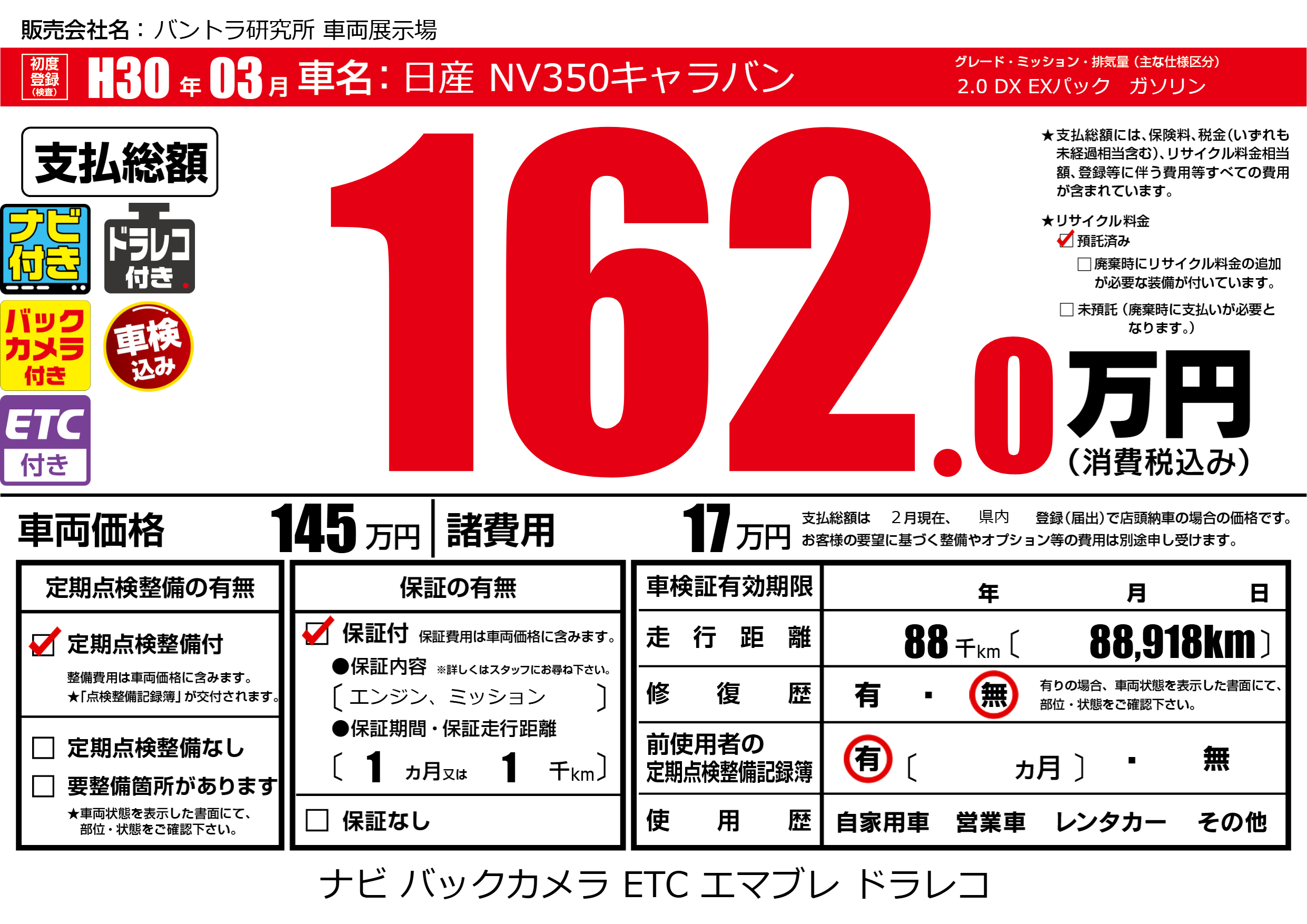 | 車名 | 日産 NV350キャラバン | グレード ミッション 排気量 |