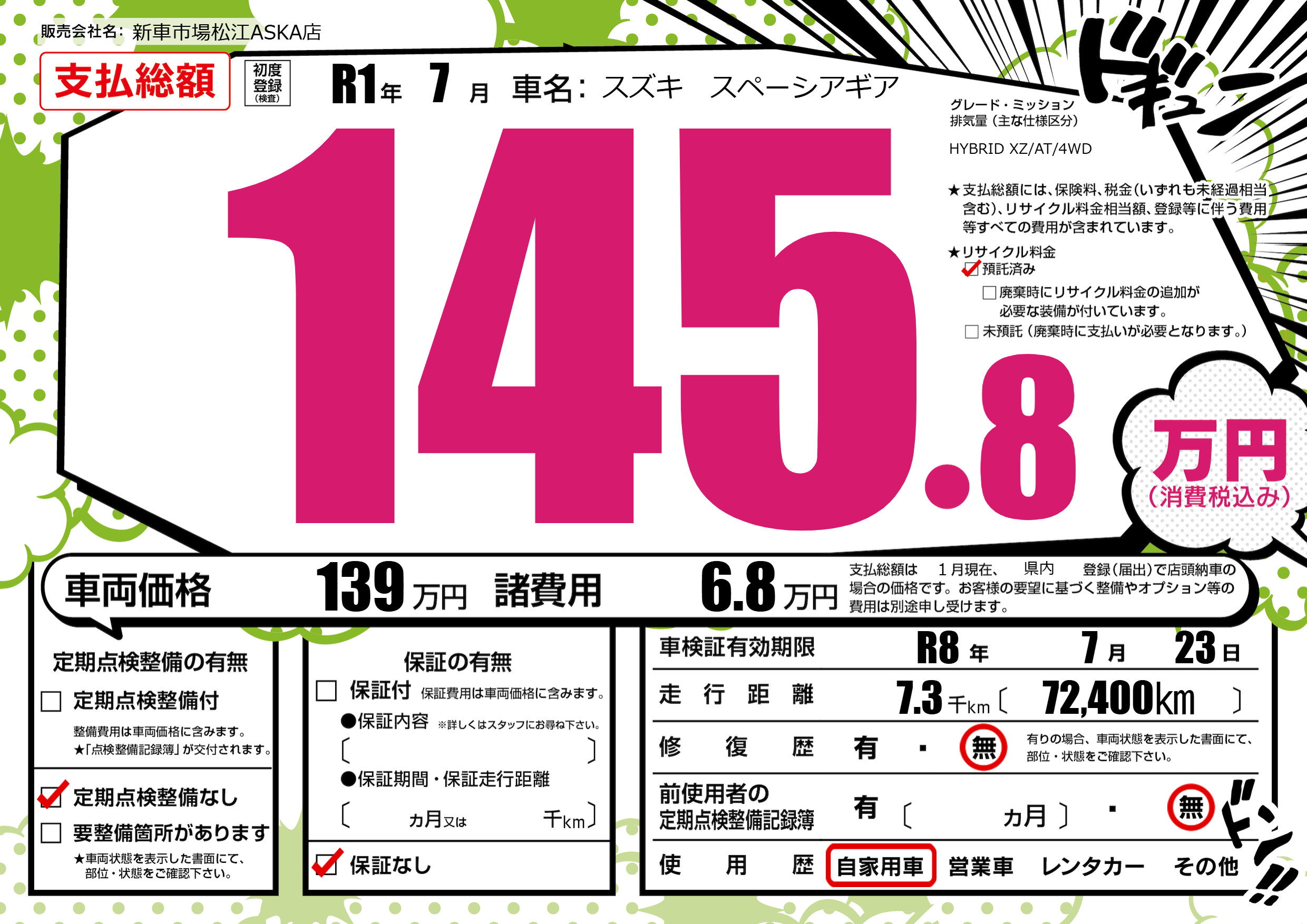 | 車名 | スズキ スペーシアギア | グレード ミッション 排気量 |